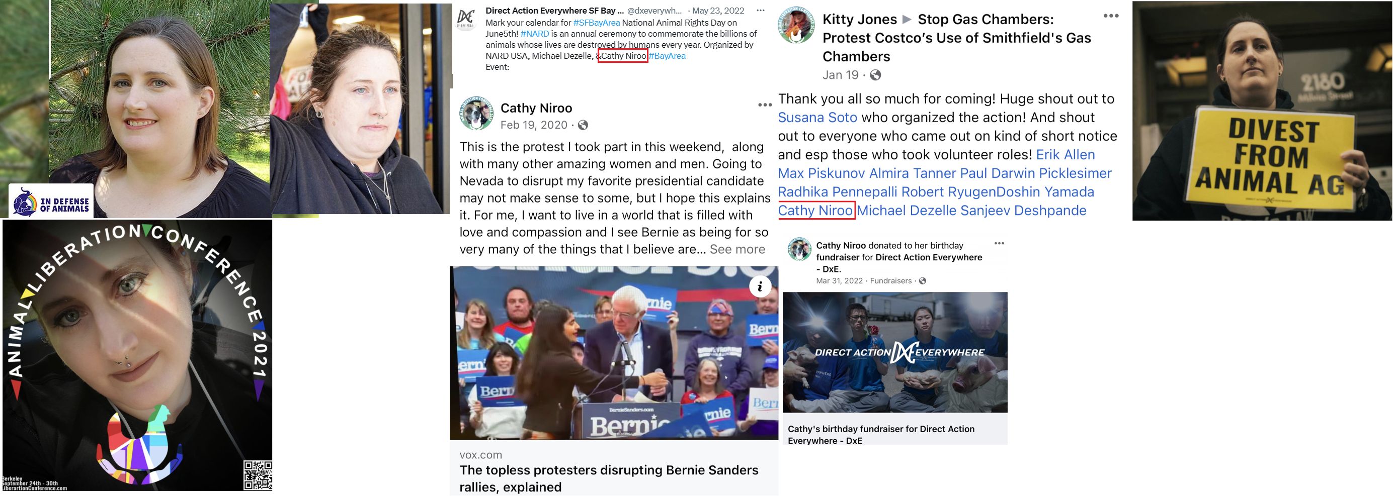Elizabeth Cathleen Niroo, aka Cathy Niroo, (DOB: 03/29/78) is a member of the radical animal rights group Direct Action Everywhere (DxE). She participated at a 2020 topless protest at a Bernie Sanders rally although it's unclear if she bared her tits. Niroo was also one of the organizers of DxE's National Animal Rights day celebration in 2022. She uses Niroo publicly but her legal surname could be "Neal". Some people finder sites show her residence as New Mexico although she posts on social media that she lives in the Bay Area and she's participated in numerous Bay Area protests. Niroo works as a nurse and is a lesbian and a wiccan. https://archive.ph/sZp3F