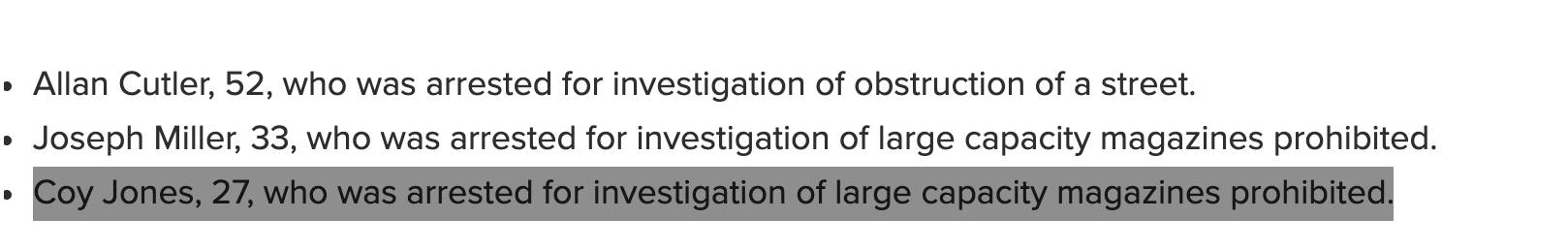 https://www.9news.com/article/news/crime/denver-breonna-taylor-protests-arrests/73-3843e873-babd-469a-9248-f065702e3aed Coy Jones, 27, who was arrested for investigation of large capacity magazines prohibited.