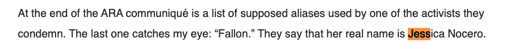 https://drive.google.com/file/d/1r7MEVzNHKh8FQ-wGTmiCbPhQAvp9RHpV/view https://www.facebook.com/IndianaAntifa/posts/communique-on-the-jessica-nocero-jennifer-gaddy-and-stacey-barnesadopted-and-pub/1530217050351093/ https://www.salon.com/2017/11/04/info-wars-lefts-online-effort-to-out-white-supremacists/ Jessica Nocero AKA Oracle AKA Fallon– Great Lakes Antifa