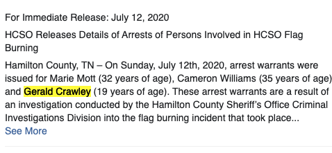 The Hamilton County Sheriff's Office has charged Mott, Williams, and Gerald Crawley with Theft under $1,000, Vandalism Under $1,000, Reckless Burning, and Inciting a Riot. Mott admitted to taking a Hamilton County Sheriff's Office flag and burning it in Miller Park. https://www.wrcbtv.com/story/42358781/update-warrants-issued-for-multiple-chattanooga-protesters-including-activists-marie-mott-and-cgrimey