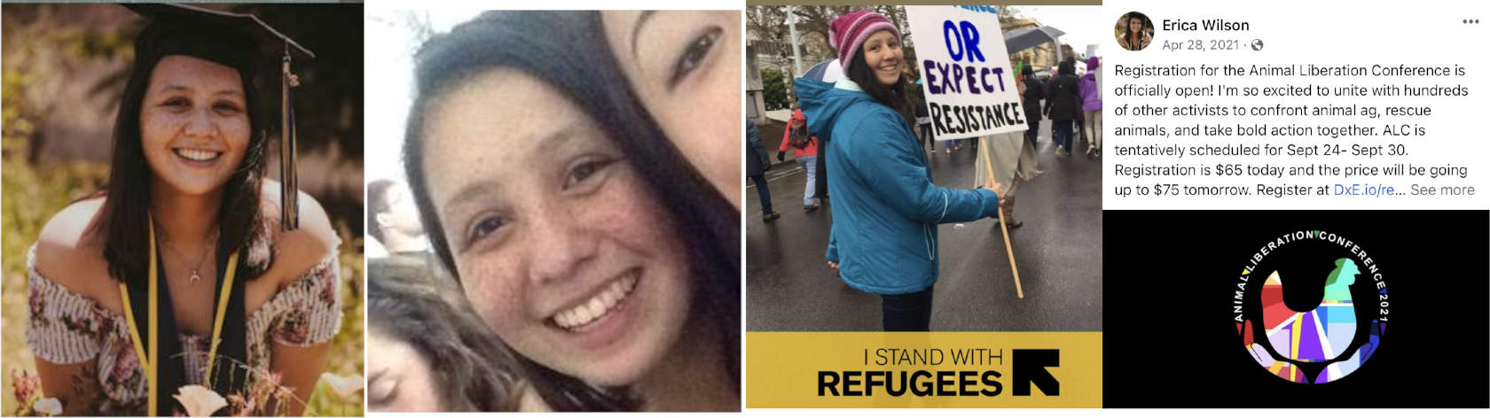 Erica Rose Wilson (DOB: 02/06/99) is a legal assistant for radical animal rights group Direct Action Everywhere (DxE). She headed the San Francisco chapter's criminal defense group, so I guess she was really busy. She studied poly-sci at UC-Berkeley. Wilson lives in Moraga which is in the hills east of Oakland. https://web.archive.org/web/2/https://uploads-ssl.webflow.com/5e87bc51b914fafd5354ac2a/5fcc4610fca8cb7ec8f2a854_DxE%20SF%20Bay%20Area%20Chapter%20Member%20Handbook.pdf (p. 14)