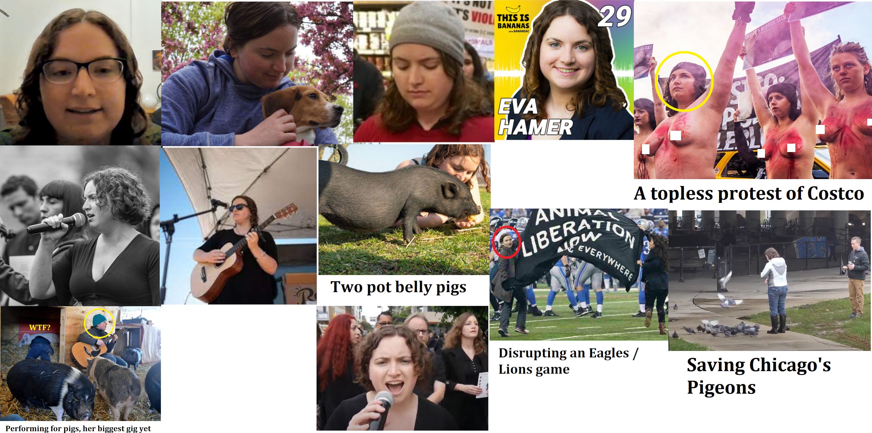 She's a legal coordinator and protest musician for the radical animal rights group Direct Action Everywhere (DxE). She's also affiliated with Pax Fauna. She stormed the field during a 2015 Detroit Lions Thanksgiving Day game in a protest against turkey consumption. Hamar stole a chicken from a farm in 2017 and was kicked out of Whole Foods during a protest at the store's grand opening that same year. While she was living in Chicago, she participated in periodic pigeon saves?!? In 2020, she participated in a topless protest of Costco. She's a music therapist by training. Her current residence is uncertain but it's probably in Oakland. She's worked in Chicago and Denver too. https://archive.ph/9nmEJ https://archive.ph/Yt25w https://archive.ph/ZuA5g https://www.youtube.com/watch?v=THUJmd50M0E&ab_channel=bananiac https://www.linkedin.com/in/eva-hamer