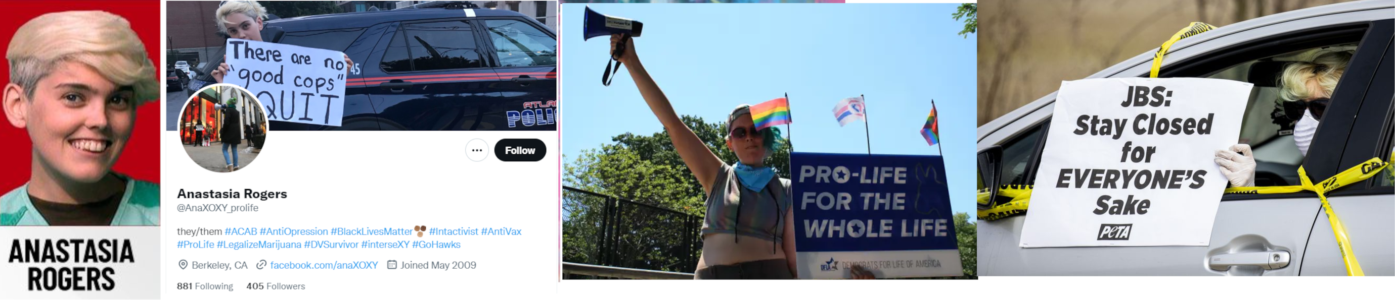 She's an organizer for the radical animal rights group Direct Action Everywhere (DxE). She was arrested with four other DxE for holding funerals for piglets in the front yard of an Iowa Food company's CEO. Ironically, she was charged with injury to animals among other things. She's undoubtably a radical but she claims on her Twitter profile to be pro-life and anti-vax. She's also a police abolisher and BLM supporter. Rogers is a natural tranny who claims to have been born intersex with ambiguous genitalia and male chromosomes so she's technically male although she has a vulva and had surgery to remove internal testes. She appears to have lived as female her entire life and claims to be non-binary and pan-sexual. Rogers lives in Berkeley where DxE is headquartered. Be aware that there's a woman of the same name living in San Francisco who bears a strong likeness to radical Rogers but the other lady is a Marine wife and homemaker. https://archive.ph/wm3Gb https://archive.ph/9oJXP https://archive.ph/Oh36V