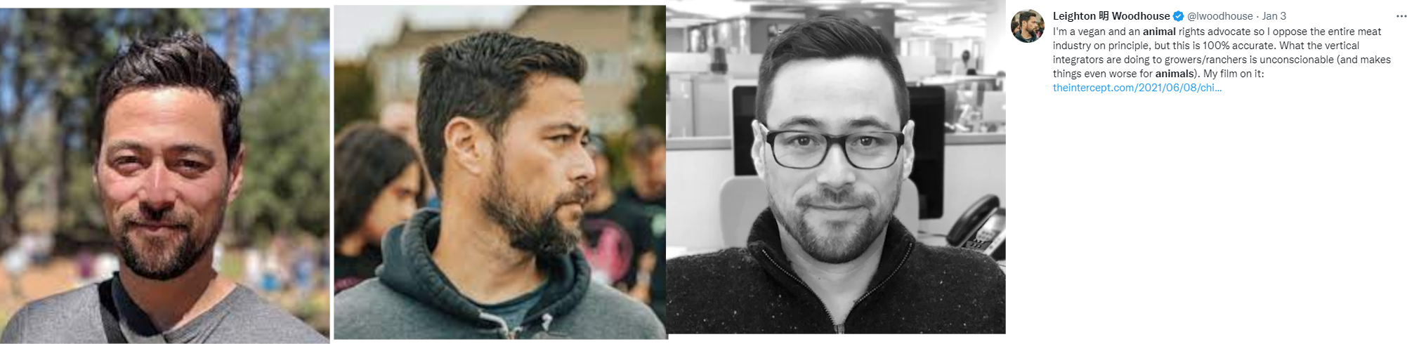 Leighton Aiko Woodhouse (DOB: 02/02/75) is a journalist and documentary film maker who's a member of Direct Action Everywhere (DxE). He was named DxE's member of the week in July 2021. Woodhouse appears to have documented some of DxE's "direct actions" on farms. Most of his journalism focuses on animals and logging. He's a Bernie Bro who supported the Sanders campaign in 2016. https://web.archive.org/web/2/https://www.consumerfreedom.com/2021/08/the-intercept-uses-journalist-in-bed-with-criminal-activist-group/