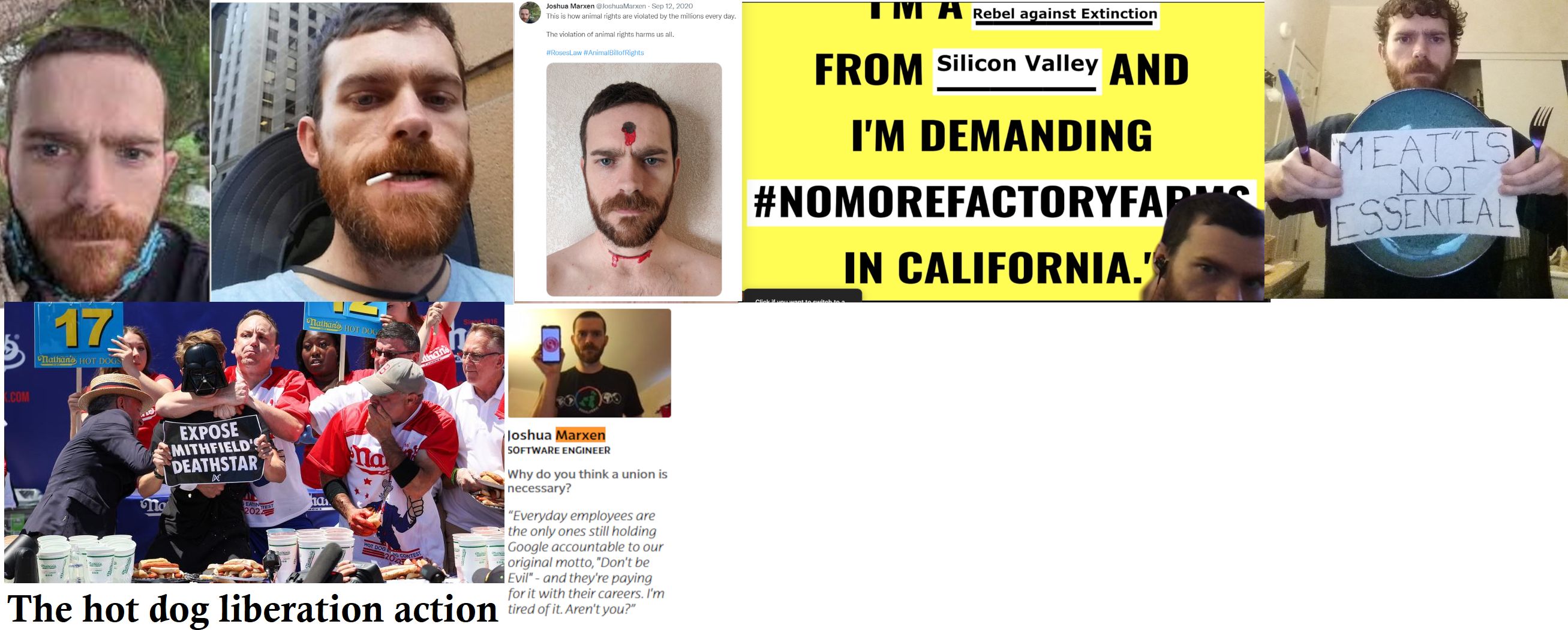 Joshua Todd Marxen (DOB: 02/10/91) is an animal rights radical and a member of Direct Action Everywhere (DxE). In 2022, he travelled to New York with two other DxE members including Buddhist monk Robert Yamada (https://antifawatch.net/ViewReport/8227cc2b). The trio disrupted the annual Nathan's July 4th hot dog eating contest. Marxen appears to be active in the Google workers' labor union. He was one of the signers of an open letter to Google urging the company to do more to fight climate change. When he's not liberating hot dogs, he works as a software engineer for Google Cloud. Marxen lives in an apartment in Santa Clara. There's a Beaverton, Oregon real estate agent with the same name who resembles the radical Marxen but it's a different person. https://archive.ph/0mEwC https://archive.ph/eLTWv