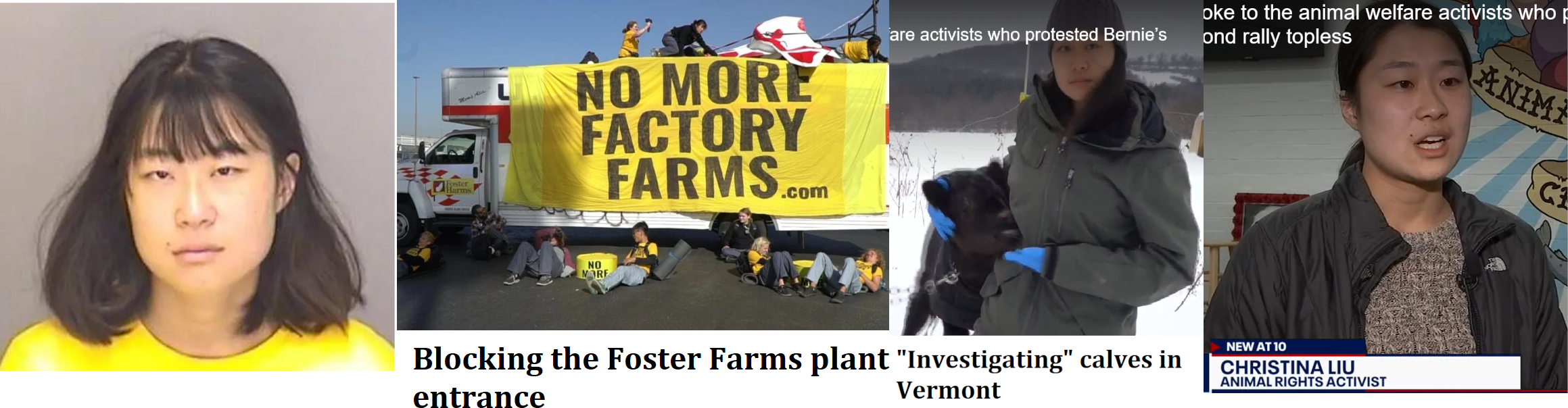 She's an organizer and investigator for the radical animal rights group Direct Action Everywhere (DxE). Liu traveled to Vermont to "investigate" the mistreatment of dairy cows and presumably trespassed on the farms but wasn't arrested. She was upset because the cows were outside in the snow even though they were able to enter enclosed shelters if they chose to do so. She attended a 2020 Bernie Sanders rally in Nevada where three DxE protesters bared their boobies, but Liu remained clothed. Liu was arrested in 2021 for blocking the entrance to a Foster Farms plant in Livingston California and charged with trespassing and resisting a public officer. As of 2022, Liu was studying for a law degree at UC-Berkeley, and she probably lives in the area. https://archive.ph/xeZ8l#selection-2209.0-2209.13 https://archive.ph/NGc95