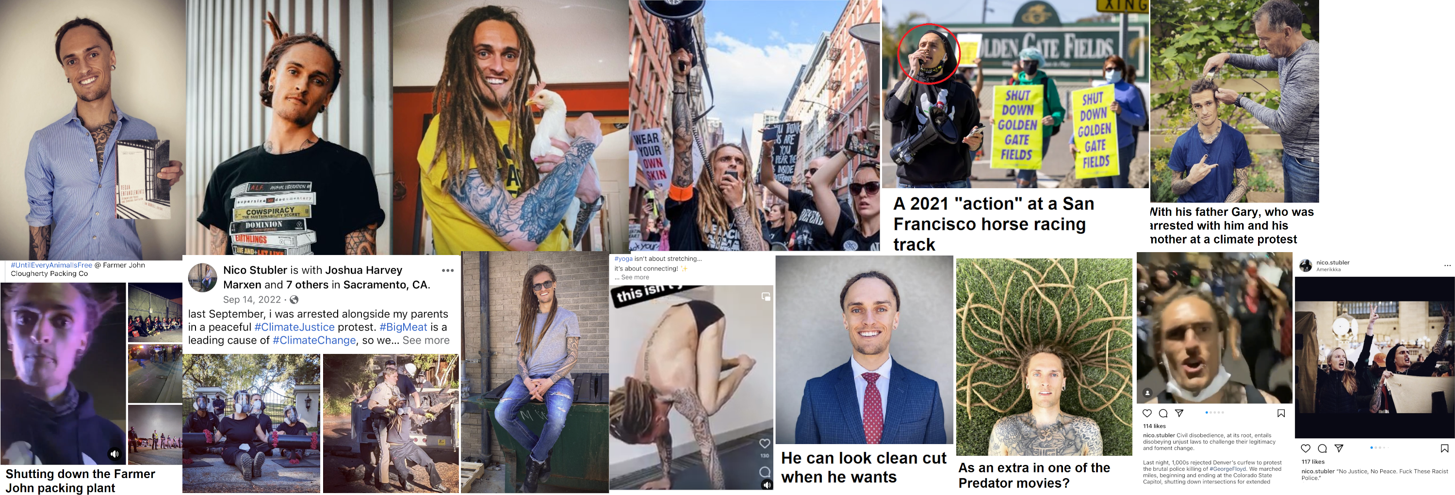 Nick "Nico" Dillon Stubler (born Apr. '94) is an organizer for the radical animal rights group Direct Action Everywhere (DxE) who was arrested at an animal theft on a Sonoma County (CA) farm in the late 2010s. His charges may have been dropped. Stubler participated in a 2020 shutdown of a Farmer John packing plant in Vernon, California. He participated in at least one June 2020 George Floyd riot in Denver where he chanted "We want justice, f**k your curfew." (See his Instagram). He doesn't show up in arrest records from that riot. In 2021, he participated in an "action" at a San Francisco horse racing track at which four DxE members were arrested. He was arrested at a 2022 "climate justice" protest along with his parents, Gary and Patti Stubler in Sacramento. Stubler's most notable physical feature is the huge number of tattoos on his body. He has sleeve tats on both arms as well as a large tattoo in Hindi script on his back. He has an M.A. in animal studies from New York University. We're not certain where he lives. He claims to have moved to Berkeley, but his last known address was his parents' home in Grand Junction, Colorado and he claims to have been active in BLM protests in that state. Berkeley, where DxE is headquarted, is the best guess. https://archive.ph/lXRbp#selection-1185.690-1185.703 https://archive.ph/LfL3Z https://www.banmeat.com/blog https://nstubler.wordpress.com/author/nstubler/ https://www.linkedin.com/in/nstubler