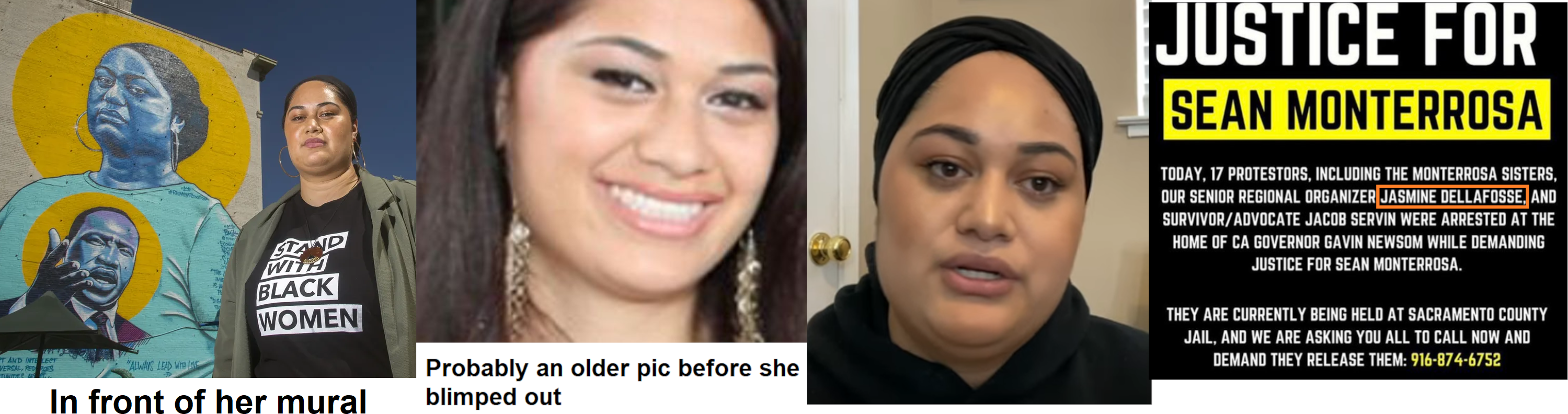 Jasmine Fiagafaga DellaFossee was one of the organizers, along with the Monterrosa sisters (https://antifawatch.net/ViewReport/b527c9ce), of an anti-police protest at the California Governor's Mansion in 2020. Sean Monterrosa was looting a Walgreen's in Vallejo during a George Floyd riot when he was shot dead by police. DellaFossee seems to be a run-of-the-mill activist, but she was notable enough to have a mural of her painted on a Stockton building. She lives in her father's Stockton home with a lot of other people. See pics for proof she was arrested.