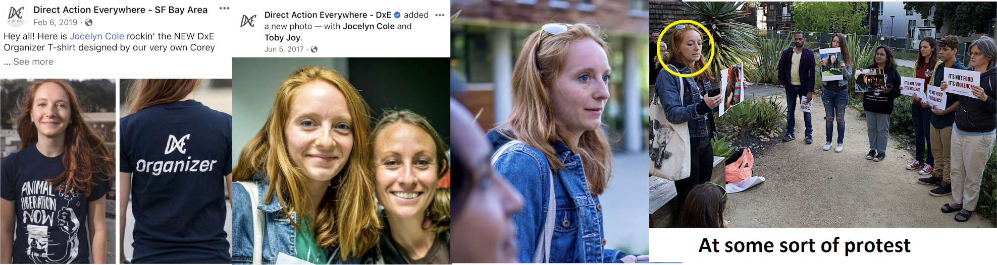 She's an organizer for the radical animal rights group Direct Action Everywhere (DxE) who was arrested at a "direct action" at a Sonoma County (CA) farm in the late 2010s. She seems to be friends with fellow DxE member Toby Joy, and they're seen together in numerous photos. Cole is believed to live in California, probably the SF Bay Area. https://archive.ph/lXRbp#selection-1185.360-1185.372