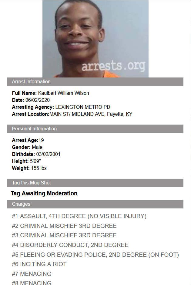 Drug a father out of a car during a protest and beat him into a concussion: https://spectrumnews1.com/ky/lexington/news/2020/06/04/lexington-police-search-for-suspects-in-attack He has past arrests for terroristic threatening