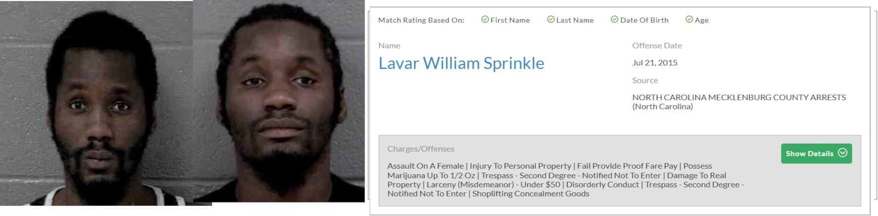 Lavar William Ernest Sprinkle (DOB: 01/01/89) was arrested at a May 2020 George Floyd riot in Charlotte and charged with felony breaking and entering, larceny after breaking and entering and failure to disperse. He had priors for assault on an officer, assault on a female, shoplifting, trespassing, damage to real property, disorderly conduct, possession of marijuana, possession of a stolen motor vehicle, probation violation and larceny. His address was listed as "unknown" on his riot arrest report so he may be a drifter. He has ties to New York City and Charlotte. https://archive.ph/bZMes#selection-4541.0-4541.14