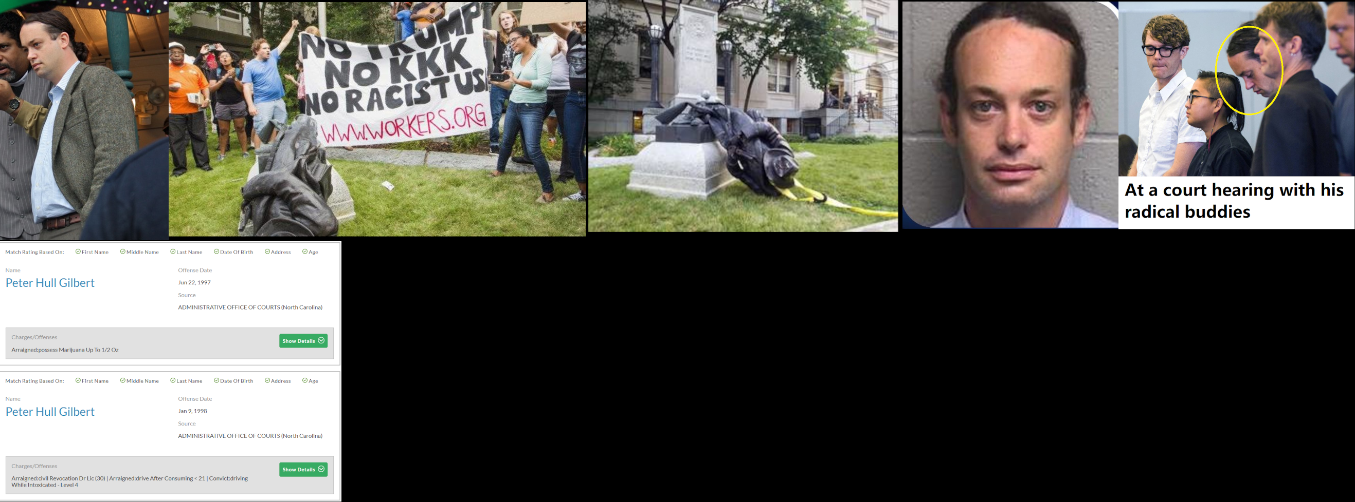 Peter Hull Gilbert (DOB: 04/03/78) is a left-wing lawyer who was arrested in 2017 for destroying a Confederate statue in front of the Durham County courthouse. He was charged with disorderly conduct, damage to real property, participation in a riot with property damage in excess of $1,500 (felony) and inciting others to riot (felony). The D.A. later dropped charges. He has prior arrests for possession of marijuana and DUI. Gilbert was active in the Occupy movement in the early 2010s and was an attorney for Occupy Raleigh. Interestingly, a convicted pedophile and child pornographer in Raleigh was using the same name in the mid 2010s but it’s a different Peter Gilbert. He's married to fellow radical Elena Everett who was also arrested at the statue vandalism. Gilbert is affiliated with about a half-dozen left-wing organizations including: Legal Aid of North Carolina, Southern Vision Alliance, UNC Center for Civil Rights and Action for Community. He works as a staff attorney for Legal Aid of North Carolina. Gilbert has a BA in physics from Yale and a JD from UNC. He’s forty-four years old and married but lives with his elderly parents in their McMansion in Raleigh. https://archive.ph/MY9tU#selection-5087.217-5087.235 https://archive.ph/snU8e Attorney page: https://www.avvo.com/attorneys/27701-nc-peter-gilbert-4291822.html