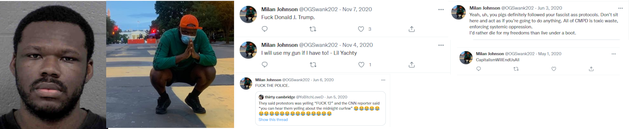 Milan Andre Johnson (04/25/97) was arrested at a May 2020 George Floyd riot in Charlotte and charged with failure to disperse. His charge may have been dismissed as it doesn't show up on his record. His Twitter feed is filled with left-wing Tweets and re-Tweets. He's working on a BFA at the Savannah College of Art and Design. Police reports listed his address as "unknown" which is usually cop shorthand for homeless but he was probably living with his mom and dad at their $700K+ home in Charlotte. Johnson seems to be an upper-middle class black dude living out a Black Panther fantasy. https://archive.ph/1w8ej