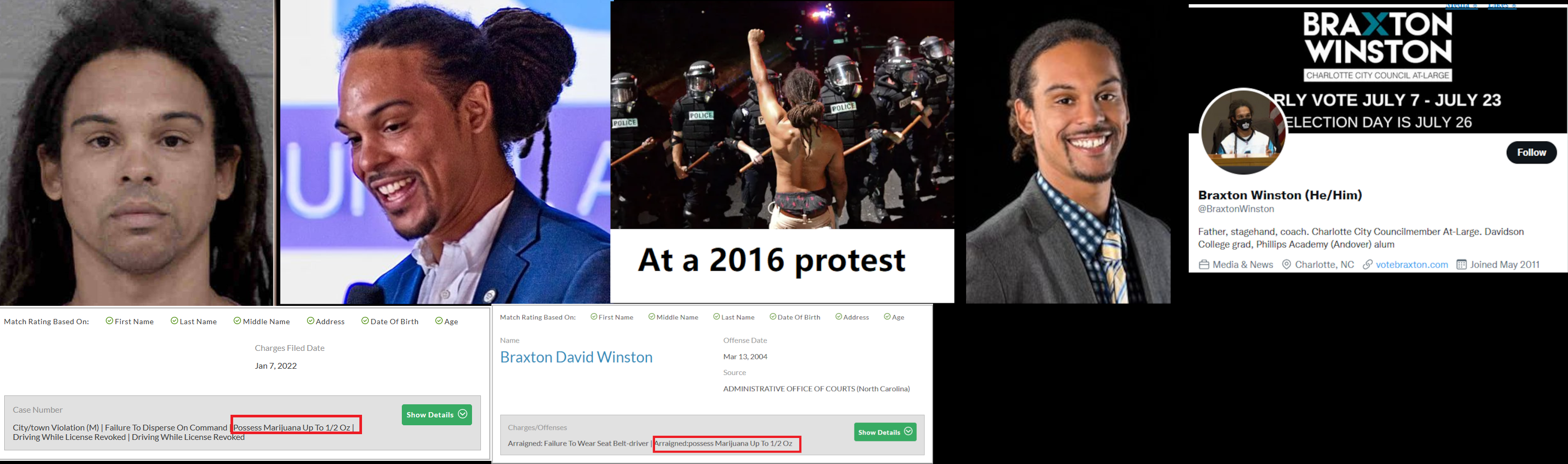 Braxton David Winston is a Charlotte city councilman and BLM activist who was arrested at a George Floyd riot in May 2020 in Charlotte. In early 2022, he was arrested on a domestic assault and battery charge but he got the charge dismissed. He likes to toke and has two marijuana possession charges. When he's not screwing up Charlotte's government, Winston works as a stage hand for a sports show. He pretends to be a journalist as a hobby. He's an alum of the prestigious and very establishment Phillips prep school in Massachusetts and Davidson College in North Carolina where he played football. https://archive.vn/002dM, https://archive.ph/4f9qu, https://archive.ph/0EBUU https://www.votebraxton.com/