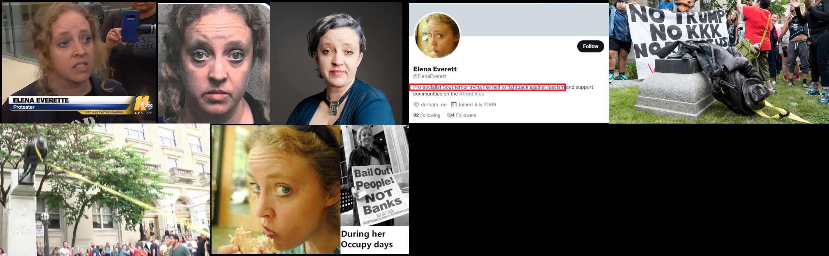 Elena Everett was arrested for pulling down a Confederate monument in 2017 in Durham. Charges were later dropped by the D.A. She began her career as a political radical while a student at NC State University where she was active in the anti-war movement and labor issues. Everett was active with Occupy Durham in the early 2010s. Everett is affiliated with over a dozen left-wing organizations in North Carolina including: NC Green Party, Durham Solidarity Center, FairVoteNC and the Southern Vision Allicance. Everett was the founder and organizer of several groups. She's a member of the communist Workers World Party. She's married to fellow radical Peter Gilbert who was arrested with her at the 2017 statue protest. She may be separated from Gilbert since she doesn’t show up as a resident at his parent’s house where he lives. https://archive.ph/aSTcO, https://archive.ph/q1iUQ, https://archive.ph/cywyL, https://archive.ph/GAfRQ