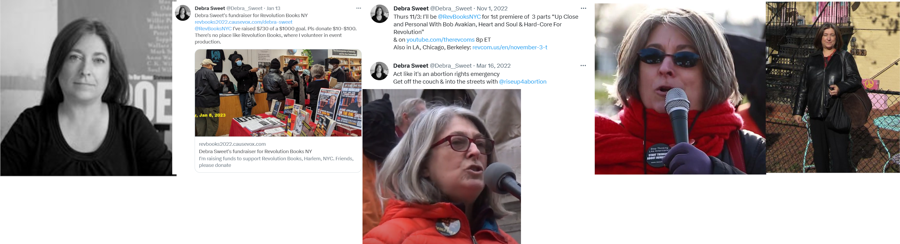 She's a national coordinator for the Revolutionary Communist Party (Revcom) affiliated group Refuse Fascism. She also was or is the national coordinator for a group known as The World Can't Wait. Sweet was active in the anti-war movement in the 2010s. She was the American Humanist Association's Heroine of the Year in 2012. She seems to have been one of the organizers of a 2016 NYC solidarity rally with Flint, Michigan, a city whose Democrat government poisoned the water supply. In 2023, she held a fundraiser for the Revcom's bookstore, Revolution Books, where she volunteers. Sweet lives in New York City. https://archive.ph/VCjIw https://www.flickr.com/photos/worldcantwait/ https://www.c-span.org/video/?197192-1/anti-war-rally https://www.youtube.com/watch?v=7kFlHZe53_c&ab_channel=WorldCan%27tWaitVideos