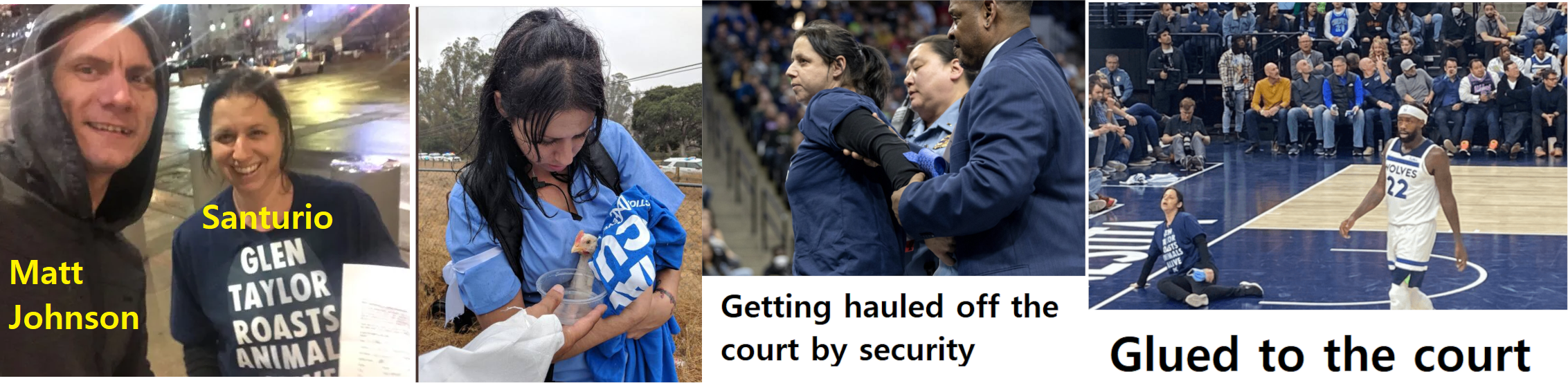 Alicia L. Santurio (DOB: 11/25/81) is an investigator for the radical animal rights group Direct Action Everywhere. Her main claim to fame is that she ran onto the court during a Minnesota Timberwolves game and superglued her hand to the court. She wasn't charged but was banned from the arena. She was pissed that the Timberwolves' owner owns a chicken company. She participated in a 2018 protest at a Sonoma County farm with Priya Sawhney (https://antifawatch.net/ViewReport/9e44a451) and Juliane Perry at which they stole a calf. The trio was charged with trespassing and grand theft. Santurio participated in a 2020 vigil for pigs outside a slaughterhouse. Santurio comes from an activist family and has been involved with radical animal rights groups for years and founded Bay Area Animal Save. Her last known residence was an apartment in San Francisco. https://archive.ph/fcQAM https://archive.ph/SNf7W https://archive.ph/HRUcP
