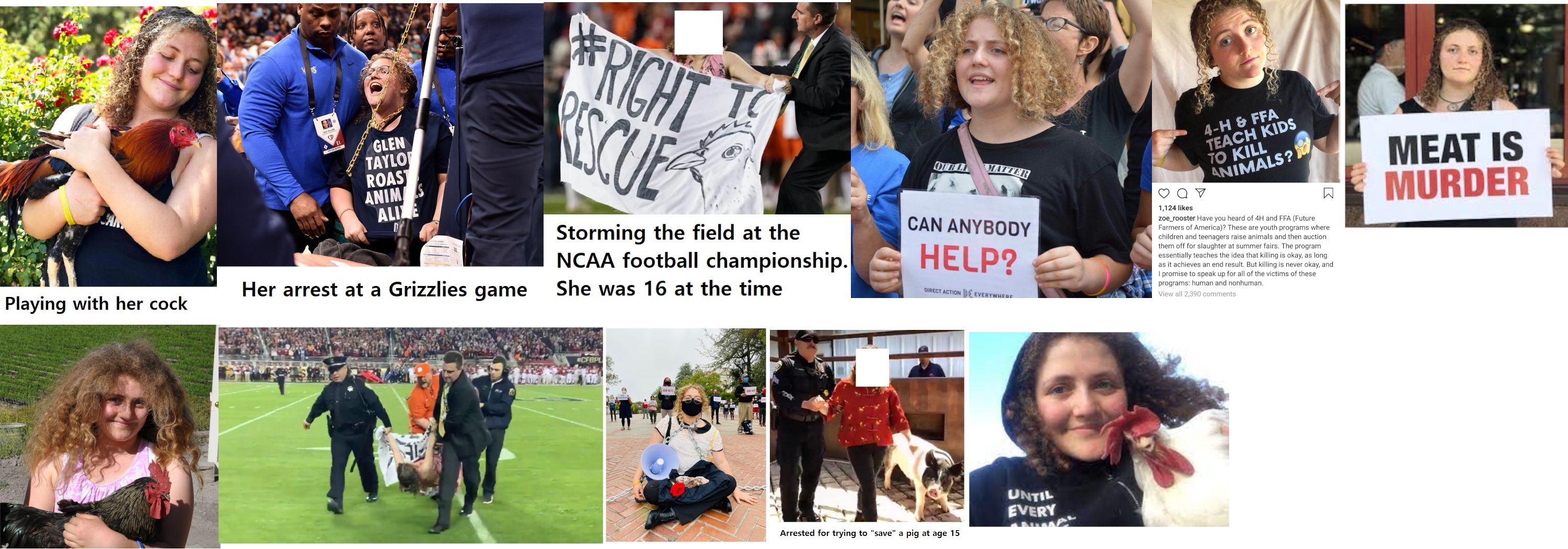 Rosenberg is an investigator and organizer for Direct Action Everywhere (DxE), a radical animal rights group based in Berkeley. She began her activism career at age 11 when she started Happy Hen Chicken Rescue. She's really into chains and chained herself to a basketball goal during a Grizzlies game in April 2022. Rosenberg was charged with disorderly conduct and criminal trespassing. She was arrested at age 15 for defending a pig which is strange since she's Jewish. That same year, she was arrested for chaining herself to a cow pen to stop the slaughter of a cow at Cal Poly Tech. She was charged with trespassing and resisting arrest. Her mother, Sherstin Rosenberg, and DxE activist Juliane Perry were also arrested. In 2019, at age 16, she ran onto the field at the NCAA championship football game while holding a banner. As a teen, she also rescued at goat named Clyde from an FFA auction. Rosenberg seems to enjoy stroking cocks as she's seen in many photos petting roosters. She's fat for a vegan which makes one wonder if she sneaks a bacon double cheeseburger occasionally. She's from San Luis Obispo but several articles implied she's a student at Cal Berkeley. https://archive.ph/ZK27u, https://archive.ph/EMK1e, https://archive.ph/qHZ8N, https://archive.ph/VpOf8 https://archive.ph/pcmM1 https://archive.ph/6RFsw https://archive.ph/IZaw6 https://archive.ph/ODGsy