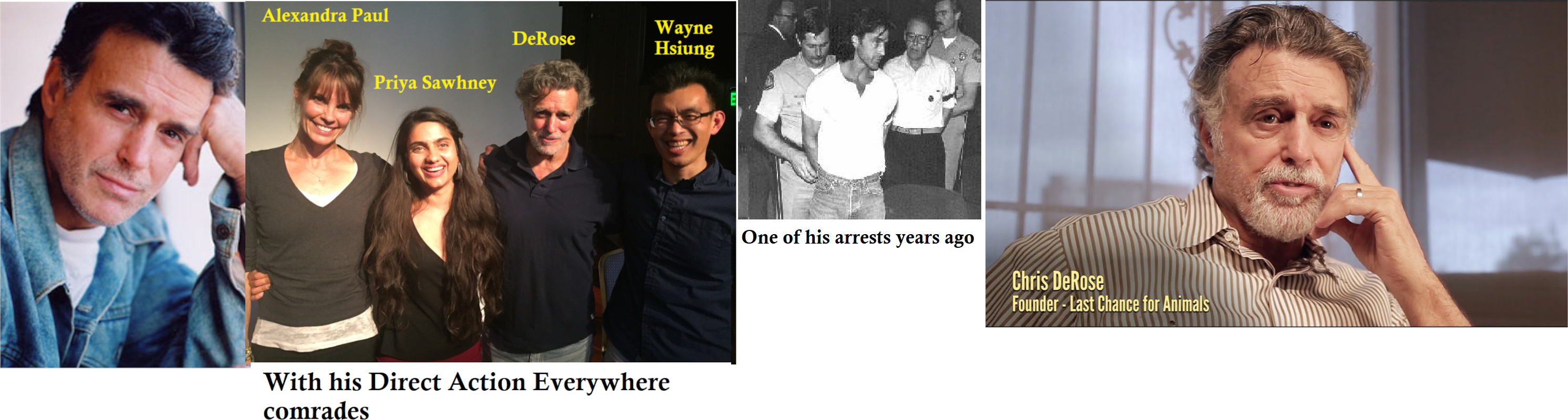 He's a washed-up actor who founded Last Chance for Animals in the 1980s. DeRose is affiliated with the radical group Direct Action Everywhere (DxE) and has appeared publicly with its founder Wyane Hsiung (https://antifawatch.net/ViewReport/02b4d408) as well as other prominent members of the organization. DeRose has allegedly been arrested 11 times for his radical activism and his arrest record goes back at least to 1988 when he was arrested for trespassing during a sit-in at UCLA. In an interview, he seemed to tacitly endorse bombings saying, "You know I always try to say that certain activities like bombings or arson — I always stay away from those things only because they are uncontrollable." If you've never heard of DeRose that's because he hasn't acted since 2010. He wrote an autobiography titled, "In Your Face" about his activism. He's believed to live in the Los Angeles area. https://en.wikipedia.org/wiki/Chris_DeRose https://archive.ph/wN0Ij https://archive.ph/3zIVN https://archive.ph/7Zy6J