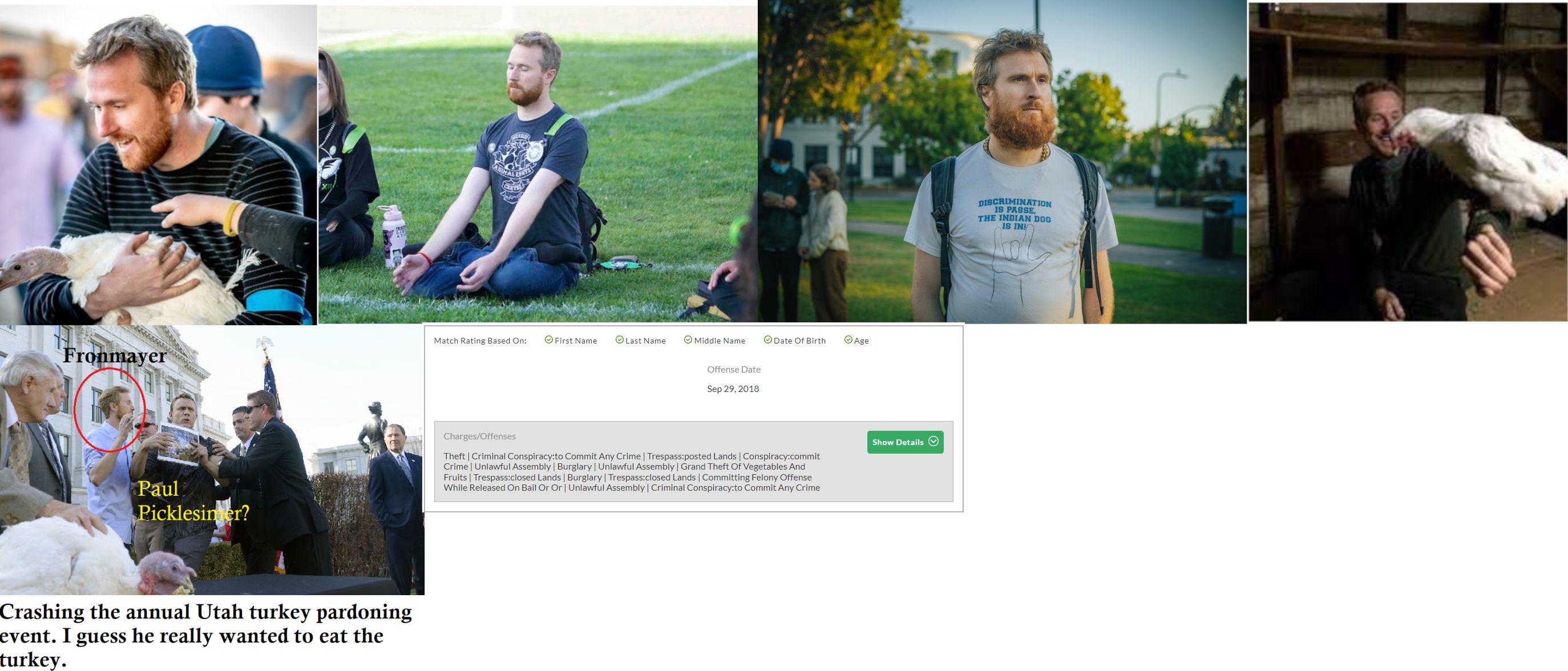 Jonathan "Jon" David Frohnmayer (DOB: 12/07/84) is an organizer for Direct Action Everywhere who also serves as the group's in-house legal counsel. For a lawyer, he sure gets in a lot of legal trouble. Frohnmayer participated in several restaurant disruptions by Vegans in the late 2010s. He was arrested in 2017 for blocking a truck attempting to enter a poultry plant. Later that year he interrupted the Utah Governor's pardoning of the Thanksgiving turkey for some reason. In 2018 he stole turkeys from a Utah farm and was charged with felonies. He's been arrested for theft, criminal conspiracy, trespassing, unlawful assembly, burglary and committing a felony while released on bail. Frohnmayer got his BA at Stanford and his JD at the University of Oregon. He's the son of former Oregon Attorney General David Frohnmayer. I'm not sure how he's able to keep his law license given the crimes he's allegedly committed. He lives in Menlo Park in Silicon Valley. https://archive.ph/VfvdD https://archive.ph/ue1f8 https://www.gofundme.com/f/help-animal-rescuers-facing-prison https://www.facebook.com/jon.frohnmayer/videos/10103695667634233/?q=jon%20frohnmayer https://www.linkedin.com/in/jonfrohnmayer