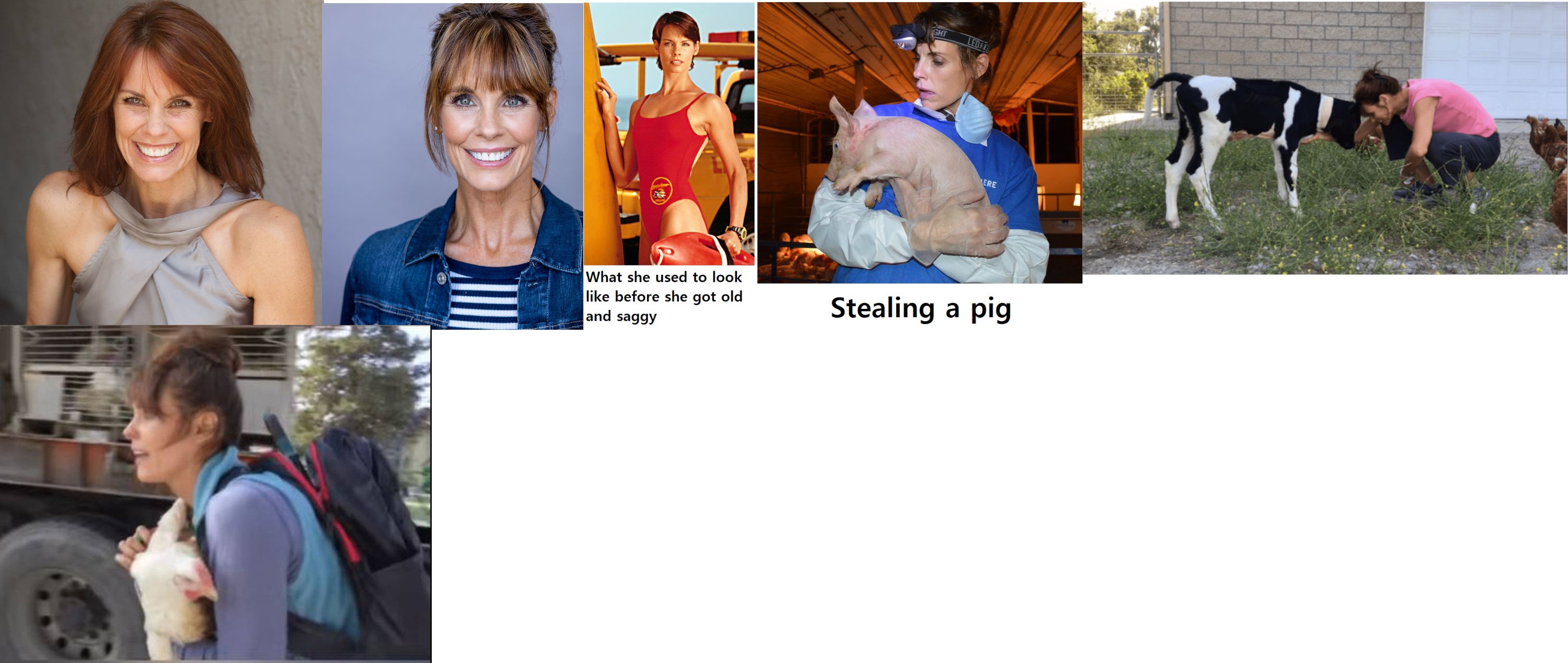 Alexandra Elizabeth Paul (DOB: 07/29/63) is a washed-up actress, triathlete and an investigator for the radical animal rights group Direct Action Everywhere (DxE). She's been a vegetarian since age 14 and is an environmentalist and peace activist. She's been arrested at many "actions". Paul was arrested twice at anti-war protests in 2003 but only spent five days in jail. She stole a pig in 2016. She was arrested at a 2017 sit-in at a slaughterhouse and was arrested in 2020 for attempting to steal a pig. In 2018 she stole a chicken. She was also arrested at 2019, 2020 and 2021 actions. Most of her charges appear to have been dismissed or expunged, perhaps the judges were Bay Watch fans. She's best known for her role on Bay Watch in the '90s but she stared in the feature film "Christine". She grew up in a rich family and attended the prestigious Groton School. She was accepted into Stanford but declined the invitation to pursue her dream of rubbing David Hasselhoff's balls on Babe Watch. Paul seems to support herself as a wellness coach. She lives in a $1.5 mil. home in Pacific Palisades near L.A. with her long-time boyfriend. https://archive.ph/Tow9J https://archive.ph/a4fpk https://www.imdb.com/name/nm0000575/ http://alexandrapaul.com/ https://en.wikipedia.org/wiki/Alexandra_Paul https://www.linkedin.com/in/alexandra-paul