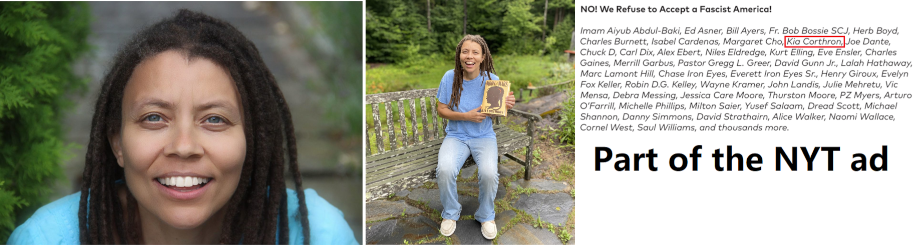 Kia L. Corthron (DOB: 05/13/61) is a writer who was one of the signers of a full-page NY Times ad by Refuse Fascism which is part of the Revcom network. The ad seemed to advocate the overthrow of the Trump "regime" prior to Trump's innauguration. Most of the plays she's written have involved social issues. She's another Ivy League leftist with a degree from Columbia. Corthron lives with her homies in a co-op apartment in Harlem. https://en.wikipedia.org/wiki/Kia_Corthron https://web.archive.org/web/2/https://refusefascism.org/2017/11/01/spread-the-refuse-fascism-ny-times-ad-everywhere/