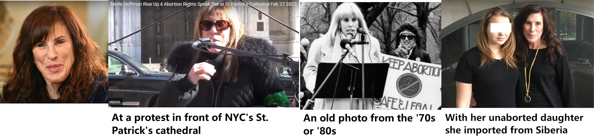 Merle Holly Hoffman (DOB: 03/06/46) is one of the founders of the radical Revcom linked group Rise Up 4 Abortion Rights. She's a long-time abortion activist who founded the National Abortion Federation in 1976 and the Pro-Choice Coalition in 1985. She also founded a NYC abortion center known as the Flushing Women's Medical Center. Despite her long history of protest, she's managed to avoid criminal charges. However, Hoffman doesn't appear to enjoy paying taxes as she had numerous state and Federal tax liens in the amounts of $211K, $650K, $970K and $220K. In our many investigations of radicals, we've never seen anyone who's owed so much in back taxes. She claims to be a journalist but seems to be a full-time activist. She adopted a non-aborted Siberian girl in the early 2000s. Hoffman lives in an apartment on Manhattan's Upper West Side. https://riseup4abortionrights.org/ https://en.wikipedia.org/wiki/Merle_Hoffman https://www.merlehoffman.com/ https://archive.ph/izQF0
