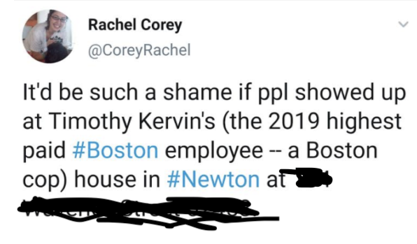 Doxxed local police officer. Encouraged leftist mobs to descend on their homes and harass/threaten them. Supports abolition of police, prisons, etc. https://turtleboysports.com/virtue-signaling-newton-rachael-rollins-campaign-organizerand-prison-reform-idiot-posts-pictures-of-boston-cops-homes-and-addresses-urges-mobs-to-go-there/