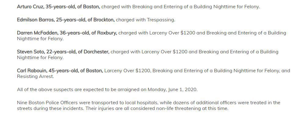 "Larceny Over $1200, Breaking and Entering of a Building Nighttime for Felony, and Resisting Arrest." Boston, Massachusetts riots of May 31st/June 1st. https://www.boston25news.com/news/bpd-release-list-53-arrests-sunday-nights-protests-that-turned-violent/XJ2EWX25KRCTVK4VRFD46OFJFE/