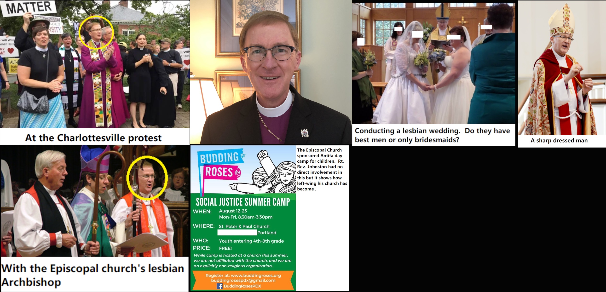 Rt. Rev. Shannon Sherwood Johnston (DOB: 10/20/58) was an organizer and leader of the clergy at the Unite the Right counter-protest. He was the Episcopalian bishop of Virginia at the time. This brings up the question, "What's the proper color of vestments to wear to a riot?". Black, I suppose. He apparently doesn't tolerate dissent very well. He co-authored a letter that said, "In our judgment, therefore, the Church cannot remain silent in the face of those who seek to foment division.” An Episcopalian bishop participating in a violent Antifa protest is not so surprising given that an Episcopal parish in Portland hosted a Antifa day camp known as "Budding Roses" several years ago. A sitting bishop probably isn't Antifa but the clergy at Charlottesville gave legitimacy to the violent counter-protest and at times were on the front lines. The good bishop got his chasuble up in a knot when several dioceses attempted to leave the Episcopal church in a dispute over gay marriage among other things. He retired with his wife to a nice row house in Richmond in 2018. https://en.wikipedia.org/wiki/Shannon_Johnston https://archive.is/Xrvl8, https://archive.is/CPtgq, https://archive.is/i9nQS, https://archive.is/8NIBn