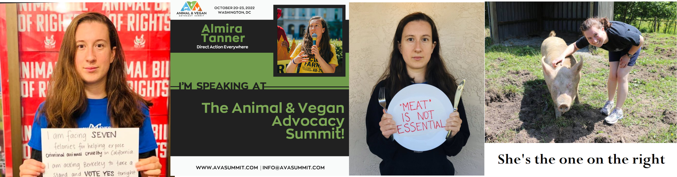 She's a lead organizer for the radical animal rights group Direct Action Everywhere (DxE), a group that kidnaps animals and stages invasions of NFL fields. Some reports claim the group's leader, Wayne Hsiung (https://antifawatch.net/ViewReport/02b4d408), turned over the leadership role to Tanner. Tanner was one of the people who lead the effort to get Berkeley to limit the amount of animal products it purchases. Tanner has an undergrad degree in biomedical physiology and kinesiology. She spent weeks in college dissecting a rabbit to whom she gave a name and that's what supposedly turned her into a vegan. Tanner lives in the Bay Area, probably near Berkeley where DxE is headquartered. https://archive.ph/ViTKQ https://archive.ph/BBefi#selection-785.8-785.21 https://archive.ph/RTBzE https://www.linkedin.com/in/almira-tanner-2b8aa36b