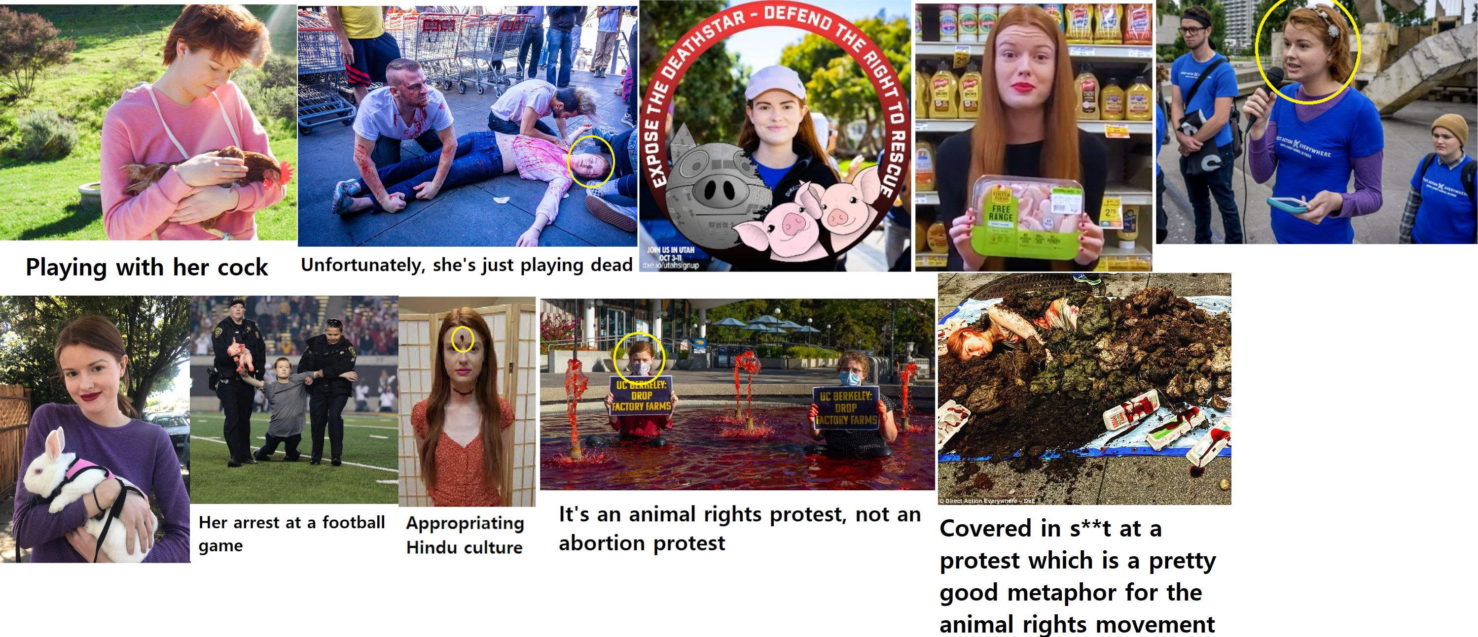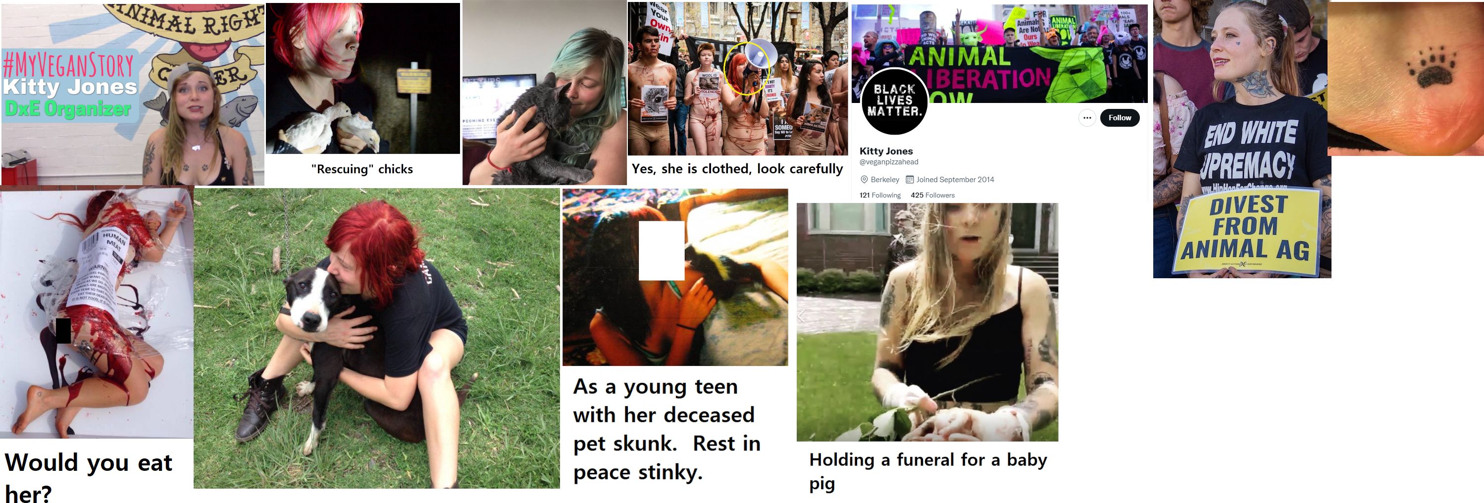 She's an organizer for the radical animal rights group Direct Action Everywhere (DxE). She was arrested in 2020 for trespassing in a gated community where a food company executive lives. Her group dug little graves and held funerals for baby pigs. She protested Amazon claiming they sell cockfighting products (perhaps she misconstrued the use of cock rings?). Jones has been effed up from an early age. At 13, she adopted a baby skunk but apparently didn't know skunks are a major rabies vector. It was taken away by authorities and killed to test for rabies. In memoriam, she got a skunk paw print on her foot. She later wrote a book about her experiences as a young animal rights activist. She has a heart tattoo under her eye and a large rose tat on the left side of her neck and often dyes her hair in wild colors. Jones attended UC-Berkeley and leveraged her expensive degree into a job with DxE. She lives in Berkeley where DxE is headquartered. https://archive.ph/flOEk https://archive.ph/umwcV#selection-1281.74-1281.85 https://archive.ph/r8InU https://archive.ph/EbGa9 (her book) https://archive.ph/V5aDF#selection-1289.14-1289.25 https://www.youtube.com/watch?v=WVvrpHp1Ras&ab_channel=VeganNews Her real first name is Kyana. https://archive.ph/wm3Gb#selection-157.33-157.44