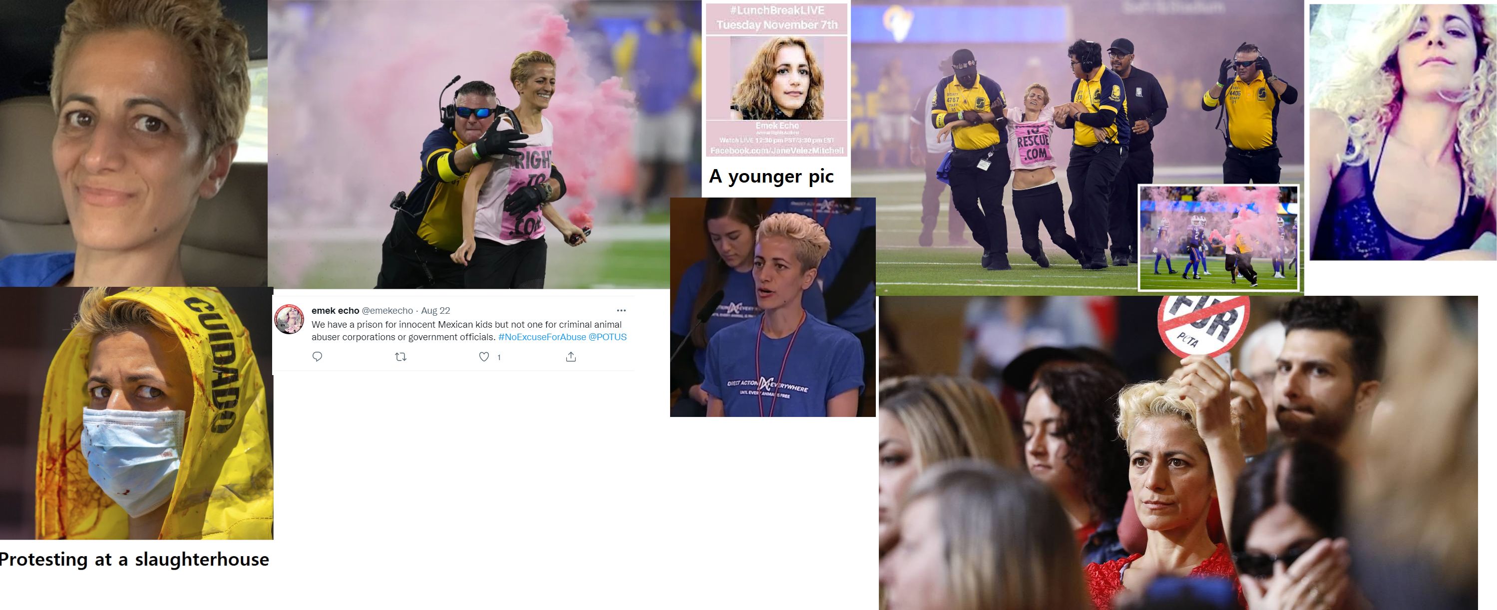 (DOB: 05/01/75), she's a member of the radical animal rights group Direct Action Everywhere (DxE). In September 2022, she stormed the field along with Katia Shokrai during the Ram's season opener. She was previously arrested in 2021 and charged with interfering with a business and resisting a public officer. The arrest may have been related to an "action" by DxE at the meat counter of a supermarket. She works as an audio engineer, music producer and graphics designer and rents a nice little home in Hollywood. She seems a bit self-conscious about her saggy, middle-aged body and uses decades old photos in her social media headers. https://archive.ph/HGgLD https://archive.ph/HqI5C (court case) https://www.linkedin.com/in/emekecho