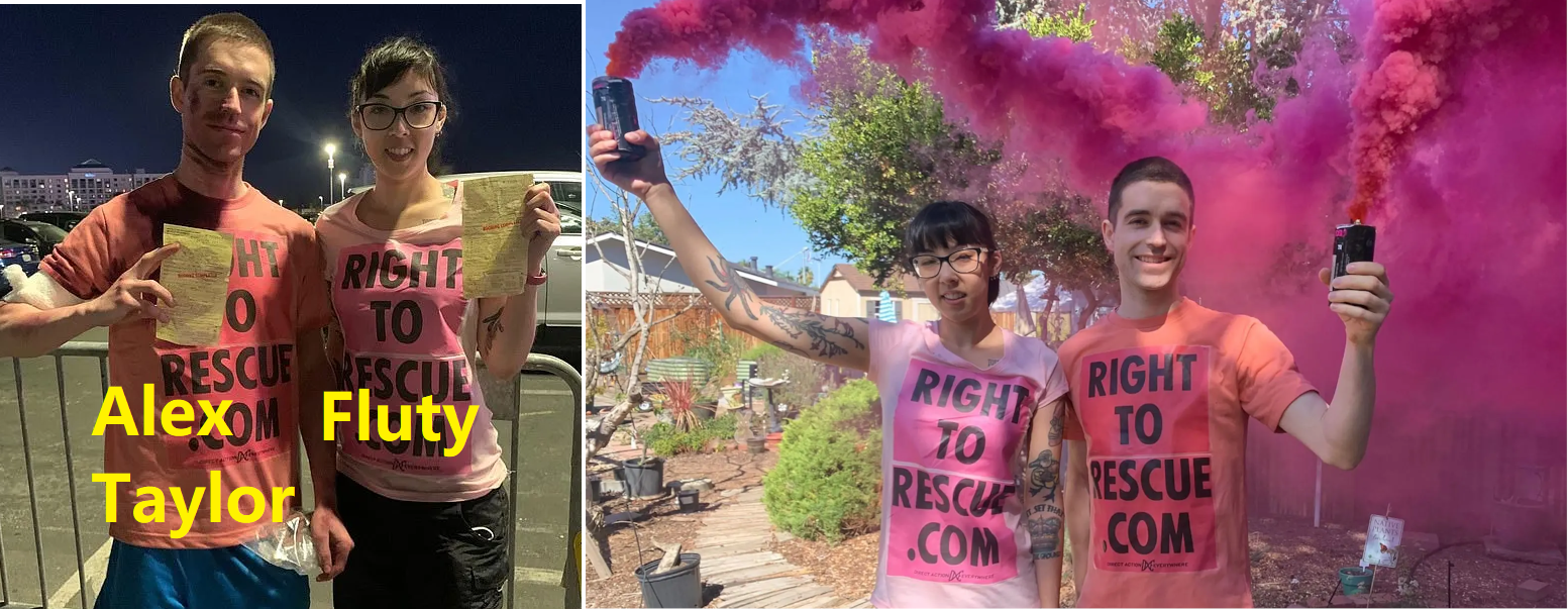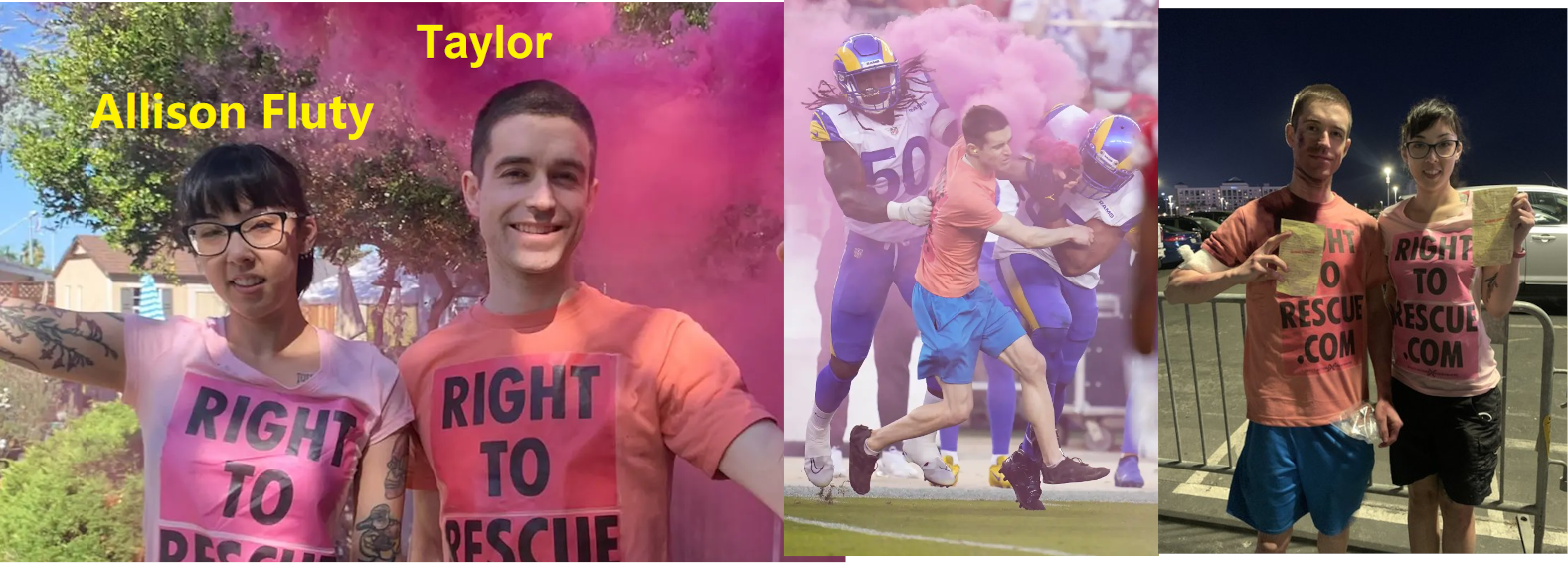 Allison Kikimo Fluty (DOB: 07/18/89) and a comrade ran on to the field during a 49s / Rams game in October 2022 and was arrested. Unlike her friend, Alex Taylor, she wasn't tackled by Rams players. Both are members of the radical animal rights group Direct Action Everywhere (DxE). The stunt was intended to call attention to two DxE members who were arrested in Utah for kidnapping piglets. This was the second field invasion staged by DxE in 2022. Fluty is a licensed marriage and family counselor. https://archive.ph/wZcDq