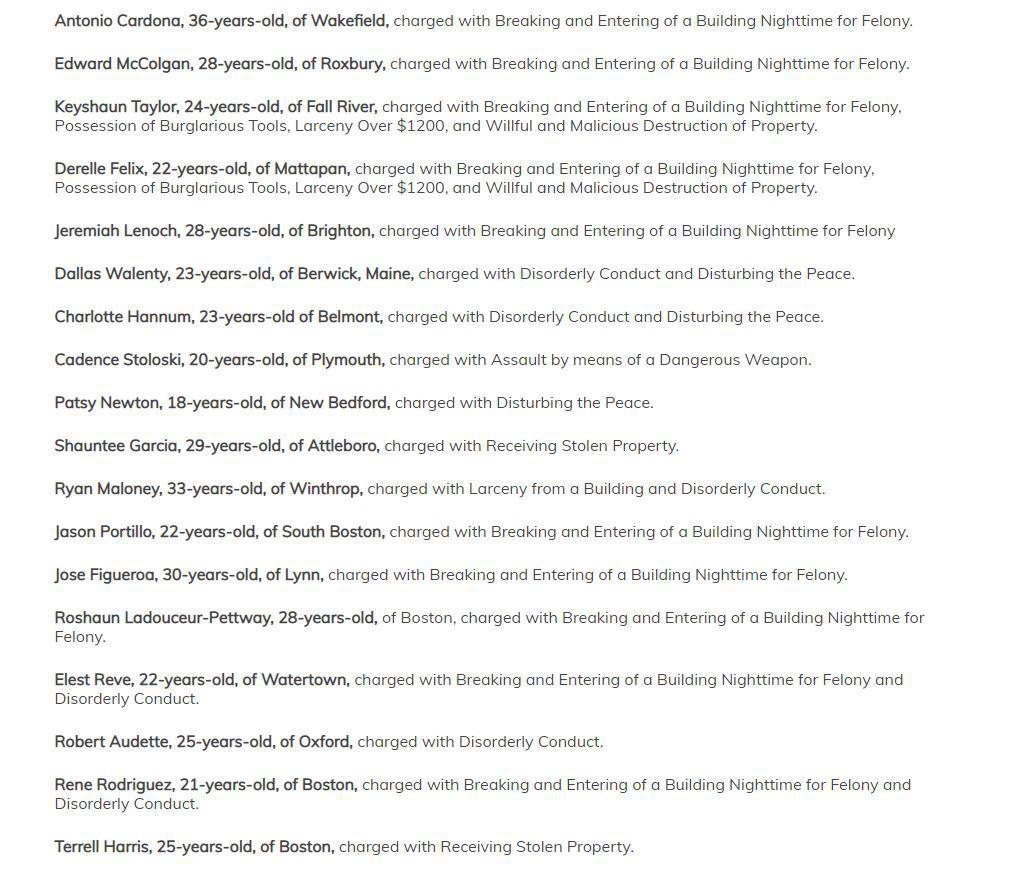 "Larceny Over $1200, Breaking and Entering of a Building Nighttime for Felony, and Resisting Arrest." Boston, Massachusetts riots of May 31st/June 1st. https://www.boston25news.com/news/bpd-release-list-53-arrests-sunday-nights-protests-that-turned-violent/XJ2EWX25KRCTVK4VRFD46OFJFE/