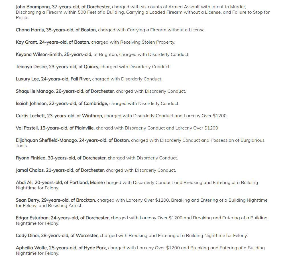 "Disorderly Conduct and Larceny Over $1200." Boston, Massachusetts riots of May 31st/June 1st. https://www.boston25news.com/news/bpd-release-list-53-arrests-sunday-nights-protests-that-turned-violent/XJ2EWX25KRCTVK4VRFD46OFJFE/ https://whdh.com/news/police-5-arrested-50-bags-of-crack-seized-in-boston-drug-busts/ Prior criminal record. Includes charges for "unlawful possession of a firearm, and possession with an intent to distribute a class A drug."