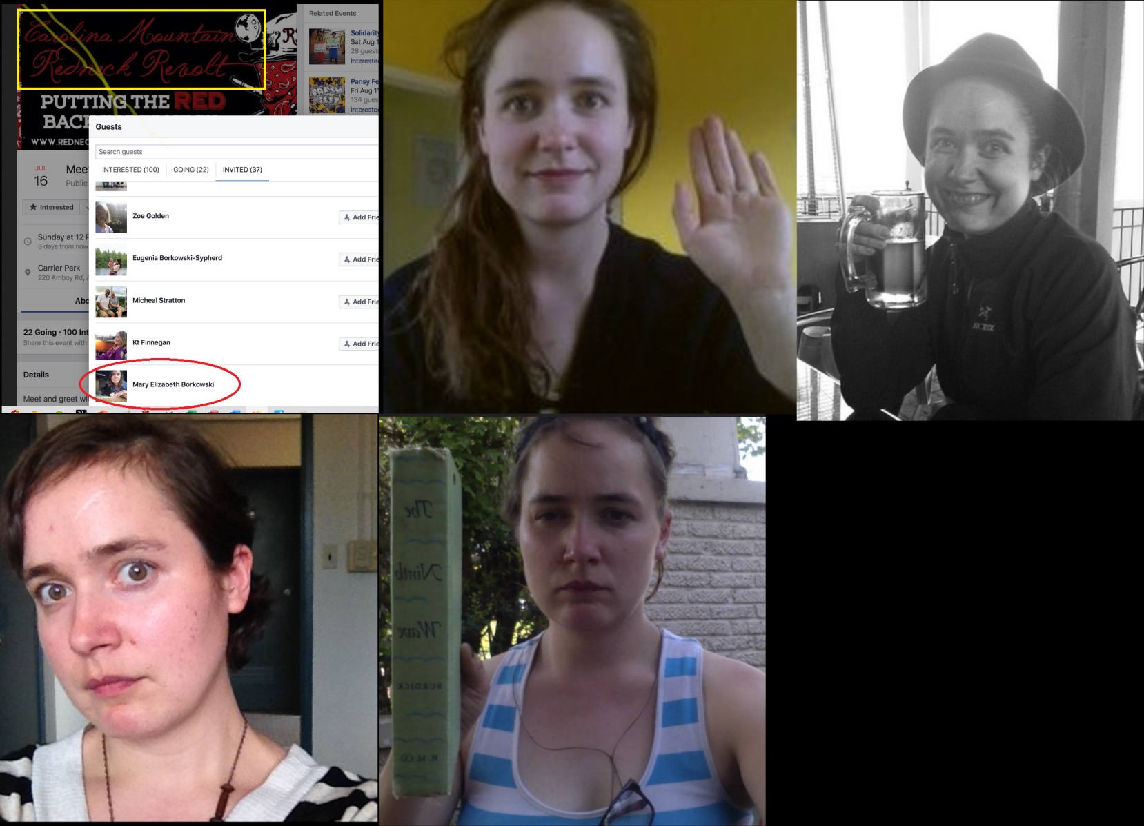 Mary Elizabeth Borkowski (DOB: 02/21/86) is probably a member or associate of the Carolina Mountain chapter of Redneck Revolt as she attended or was at least invited to one of their events in 2017. She works as the Recruitment and Awareness Coordinator at Literacy Council of Buncombe County. She has a B.A. from Columbia University in comparative literature and film. https://archive.vn/gNjhn https://www.flickr.com/photos/mebbee/
