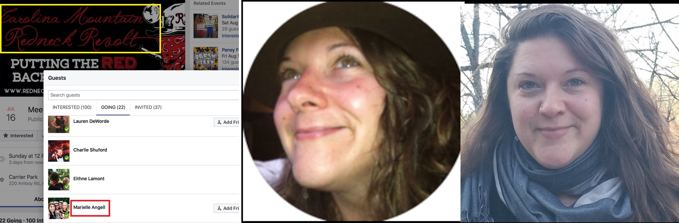Marielle Luena Angell (DOB: 07/20/83) is probably a member or associate of the Carolina Mountain chapter of Redneck Revolt as she attended or was at least invited to one of their events in 2017. Her husband or boyfriend JJ Ball also attended the event. She's worked for several leftist groups including Green Festivals and Community Roots. Angell has a disorderly conduct arrest which could be protest/riot related and several other unspecified citations/arrests. She has a B.A. in sociology from UNC-Asheville and a Masters in sustainability studies from Lenoir-Ryne College. She lives in the Asheville suburb of Weaverville. https://archive.vn/LPg4i, https://archive.vn/d7CaE https://www.linkedin.com/in/marielle-angell-38b9b6b1