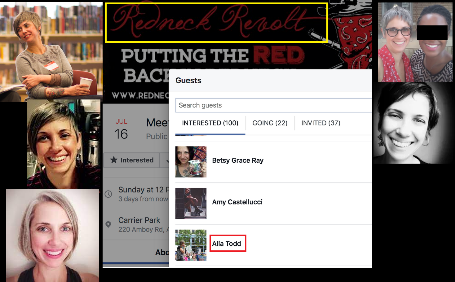 Alia Marie Todd (DOB: 08/26/76) is probably a member or associate of the Carolina Mountain chapter of Redneck Revolt as she attended or was at least invited to a 2017 event. She formerly worked as a pastry chef in Asheville but quit in 2017 to work in a succession of organizing jobs at left-wing non-profits in North Carolina. She most recently worked as a Senior Organizer for United for Respect. While in Asheville, she founded Asheville Sustainable Restaurant Workforce, an organization that advocates for restaurant workers' rights (or worker riots?). Her activism was mentioned in a 2016 Obama Administration report on the minimum wage. She's been in trouble with the law but the offenses were either traffic violations or other minor offenses unrelated to rioting. She studied American History at the University of South Carolina. Todd lives in an apartment in Raleigh, North Carolina. She's aged markedly in the past decade and allowed her hair to gray. https://archive.vn/K0A7g, https://archive.vn/5oQZ3, https://archive.vn/coK0y, https://archive.vn/KMOUl https://web.archive.org/web/20211129042946/https://obamawhitehouse.archives.gov/sites/default/files/minimum_wage/6_october_2016_min_wage_report-final.pdf (p.13)