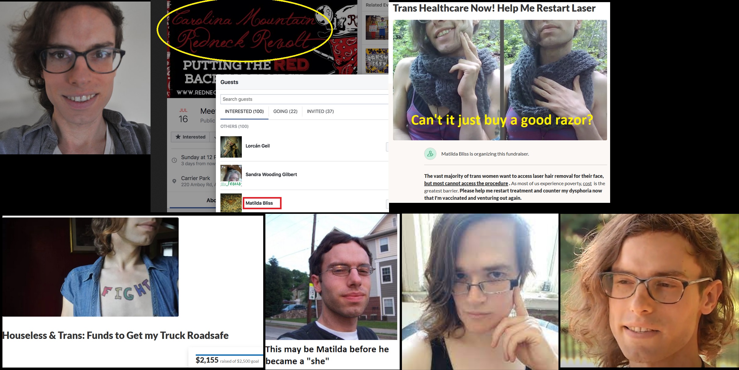 Matilda Rae Ryan (DOB: 0922/87) is a transgender (M>F) that's probably a member or associate of the Carolina Mountain chapter of Redneck Revolt. It attended or was at least invited to one of their events in 2017. It's the author of the Five Events Social Justice Calendar and a contributor to the Asheville Blade, a left-wing journalism outlet. Its Twitter feed has a lot of left-wing Tweets. It's also a member of Showing Up for Racial Justice. Bliss' legal first name is probably "Ryan". It was arrested at an Asheville homeless camp in December 2021 while supposedly reporting and its phone was taken. Bliss attempted hormone therapy in 2013 but stopped. It seems to be a professional grifter. Bliss held a GoFundMe campaign to pay for removal of exess facial hair. It's a tranny without a trans(mission)! Its truck broke down and it raised $2,000 from its buddies to pay for a new transmission. https://archive.vn/hvERx, https://archive.vn/WOFUo, https://archive.vn/6WyWY, https://archive.vn/eEDqI, https://archive.vn/nSlge https://www.patreon.com/fiveevents birth name is Ryan Matthew Bliss, dude lives out of an older grey utility/school van, has a trans flag on the side door. used to work at rise n shine cafe. got fired for just being a jerk towards folks. Also accused of being a scammer https://www.whitepages.com/name/Ryan-Matthew-Bliss/Asheville-NC/PvyBdNDJOo8 He has been fired from a job as a cook for harassment by a fellow employee. He did legally change his name its seems to Matilda or it is coming up that way in new searches. It used to come up Matthew with same results in addresses, vehicles, voter rolls, etc. Makes sense to go from Matthew to Matilda. Well makes sense in his head. Hangs with the Firestorm/Antifa crowd he is not core AAR Torch