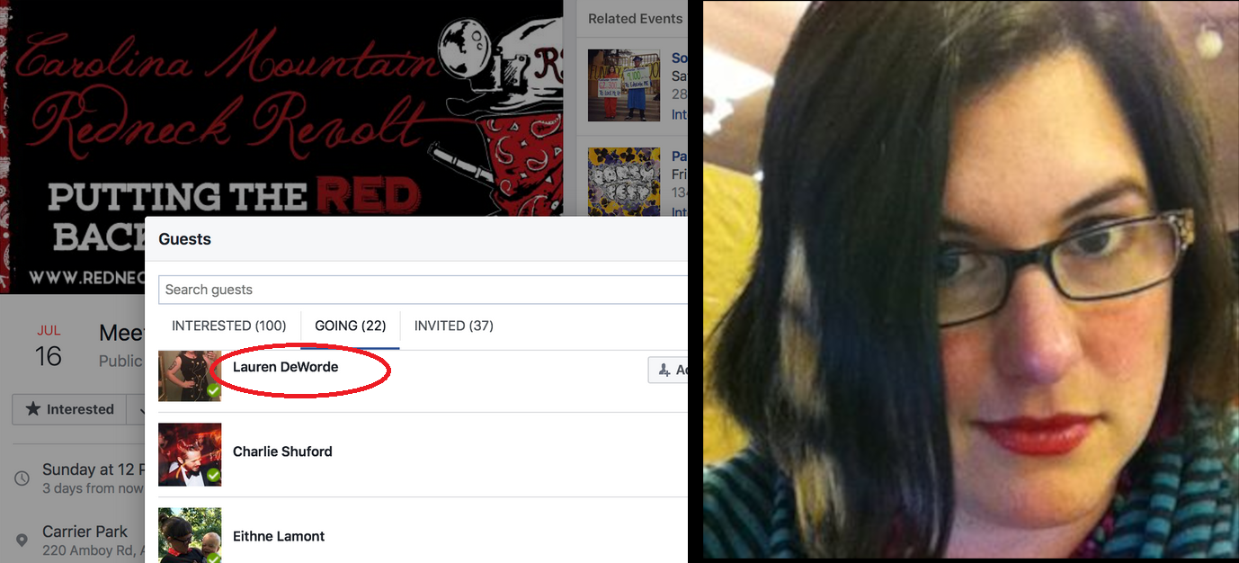 She's probably a member or associate of the Carolina Mountain chapter of Redneck Revolt as she attended or was at least invited to one of their 2017 events. DeWorde co-owns the Zapow art gallery with her husband, fellow Revolting Redneck and DSA member Jonathan Watterson (https://antifawatch.net/ViewReport/ae38eca3). She lives with her husband in Bernardsville near Asheville. https://archive.vn/LPg4i https://archive.vn/jmMYw