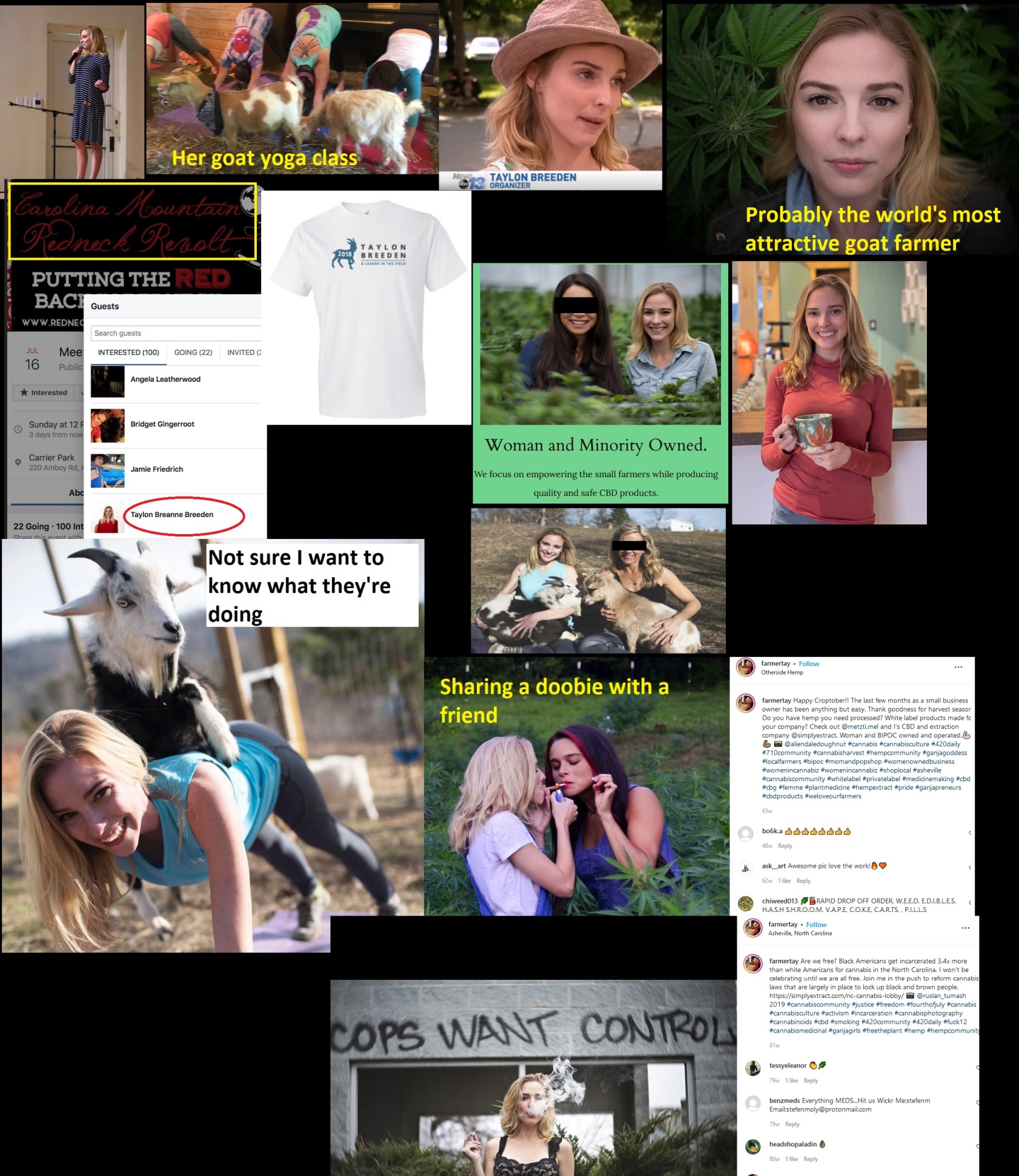 Taylon Breanne Breeden (DOB: 08/15/91) is probably a member or associate of the Carolina Mountain chapter of Redneck Revolt as she attended or was at least invited to one of their 2017 events. She's a goat farmer and activist who ran for an Asheville City Commissioner seat in 2018. She sold goat t-shirts to raise money for her campaign. Breeden is an advocate for renewable energy, substance abuse, abortion and mental health issues. Apparently Breeden doesn't want to breed as she organized a pro-abortion protest in 2019. She's probably best known for the goat yoga classes (huh?) she teaches with a fellow goat farmer. The yoga classes were featured in "Southern Living" magazine and were filmed by HBO's "VICE" show. You can attend for a fee of only $18 per person. She may be growing pot on her goat farm, which probably makes the goats very happy. She's one of the co-owners of a CBD shop that recently opened in Asheville. Breeden is from Arkansas originally and attended both the U of Arkansas-Fort Smith and the one in Fayetteville. She lives with her husband in a rustic country house in Leicester, not far from Asheville. https://archive.vn/mAH1X, https://archive.vn/UbEA4, https://archive.vn/LvRX4, https://archive.vn/y1HiQ, https://archive.vn/ft5GV