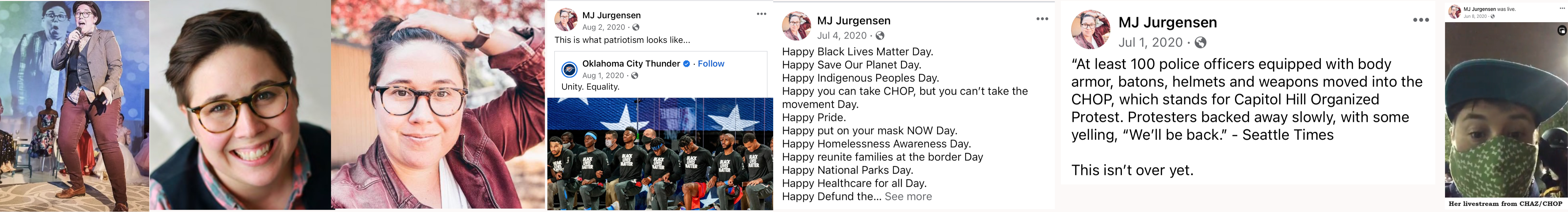 Mary "MJ" Alane Jurgensen (Born May '88) admitted in court filings to participating in several George Floyd era riots/protests in the Capitol Hill neighborhood of Seattle. Jurgensen live streamed from a Capitol Hill riot and posted footage to FB and it's still up. She was at the June 7th riot which drove the police out of Capitol Hill and led to the establishment of the CHAZ/CHOP "autonomous zone" the next day. She claimed to have been hit on the leg by non-lethal ammo. Jurgensen later sued the city. She styles herself as an actor and musician but works as an art teacher at Three Dragons Academy. Jurgensen lives in the Adams neighborhood of Seattle. https://web.archive.org/web/20231213144131/https://southseattleemerald.com/wp-content/uploads/2021/08/Third-Amended-Complaint-Draft-030221-Clean.pdf (pp. 133-134) https://www.mjjurgensen.com/