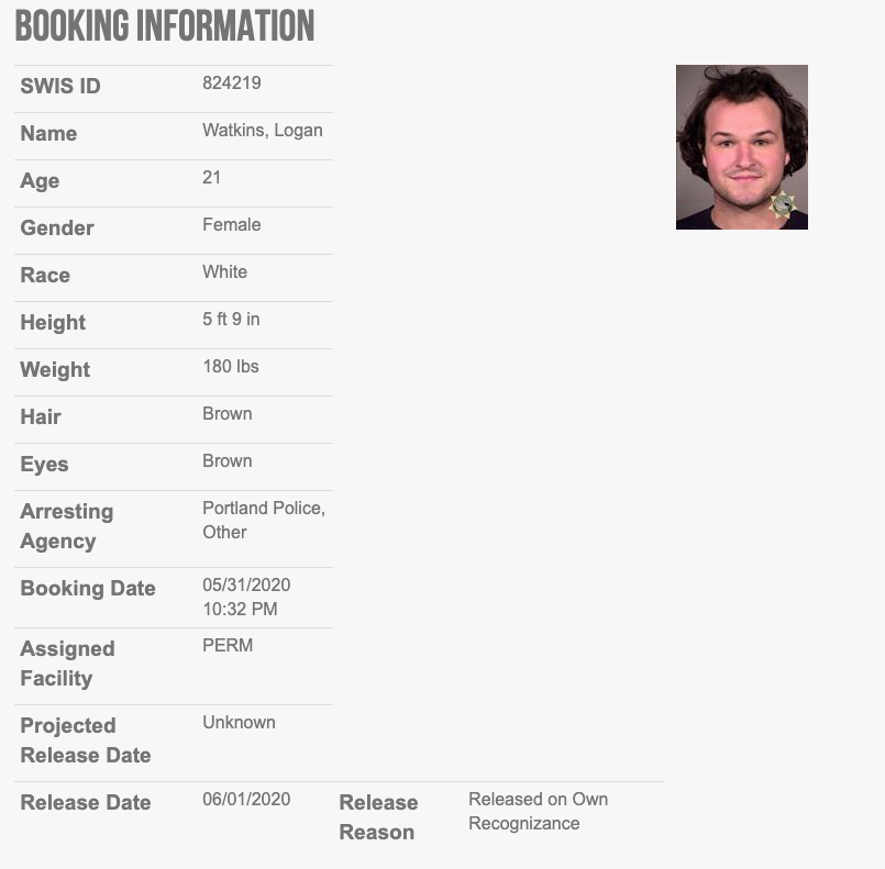https://www.mcso.us/PAID/Home/Booking/1504652 CRIM MISCH III (C Misdemeanor) INTERFER PEACE OFF (A Misdemeanor) DISORDERLY COND 2 (B Misdemeanor) RIOT (C Felony)