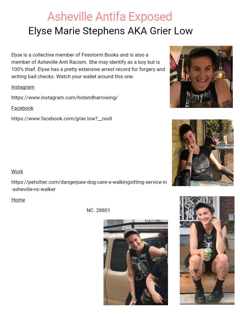Elyse Marie Stephens aka Grier Low a core member of Asheville Anti-Racism who's queer as folk music. His Antifa buds held a fundraiser, organized by notorious Asheville ARA member Elana Riback, for a surgery. He works as a social work instructor at Asheville-Buncombe Technical Community College but his main source of income appears to be a pet sitting business. He may possibly be trained as an attorney as a fragment in Google search indicates he was an attorney at the real estate law firm of Goosman, Rose, Culvard and Cramer but he no longer appears on their page. Images and most of the information is courtesy of the Albanian Armed Forces (Anti-Antifa). https://theswissbay.ch/pdf/_notpdf_/AAF%20Albanian%20Armed%20Forces/A%20ROSE%20BY%20ANY%20OTHER%20NAME/Asheville%20NC%20An%20tifa%20Network%20Map/0%20-%20MASTER%20FILES%20-%20START%20HERE/Asheville%20NC%20Auntie%20Fa%20-%20Master%20file%20part%201.pdf https://archive.vn/n5QF8 Grier Low is a biological woman. Her real name is Elyse Marie Stephens