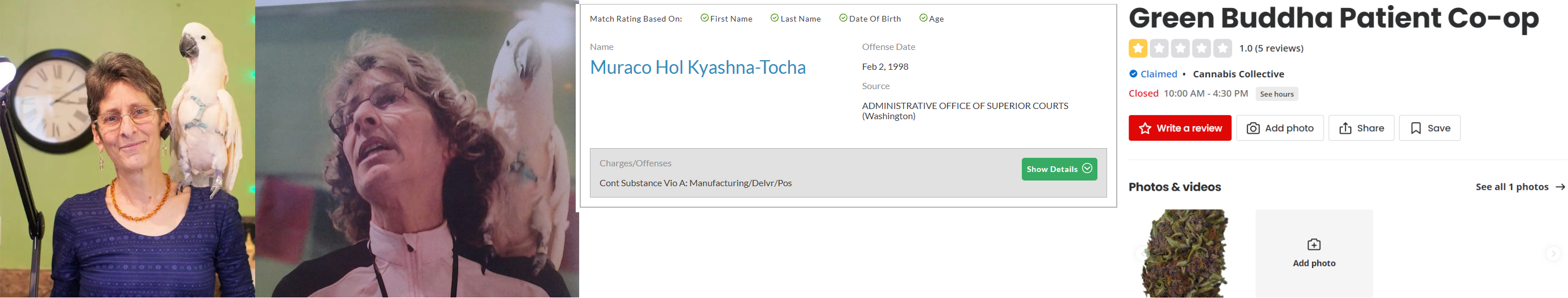 Muraco Hol Kyashna-Tocha (DOB: 12/28/59) claimed in a legal pleading to have attended every George Floyd riot / protest in Seattle from May 30th through June 6th. She "protested" in the Capitol Hill neighborhood, aka CHAZ/CHOP, during most of June. She admitted to riding with the Bike Brigade which illegally blocked streets so people could riot and she livestreamed part of a July 2020 riot. She was one of the plaintiffs in a lawsuit against the city. She ran the Green Buddha marijuana co-op in the Ravenna neighborhood for years. Her shop may have closed permanently, possibly due to mismanagement. Its average Yelp rating was one-star which is hard to do. Muraco was described by customers as very rude. She appears to have been a drug dealer before she got into legal pot and has a 1998 drug conviction for distributing a controlled substance. I'm not sure how someone with a prior drug offense gets a license to run an MJ dispensary. She works in IT when she isn't dealing drugs. She's founded several strange organizations such as the Center for Intersensual Living and the Church of the Gnostic Vine. https://web.archive.org/web/20230725161555/https://storage.courtlistener.com/recap/gov.uscourts.wawd.286633/gov.uscourts.wawd.286633.1.0.pdf (p 19) https://archive.ph/kebxC (Dispensary) https://archive.ph/L3yiT https://www.pscp.tv/w/1vAGRrpXMlDGl (Her livestream) https://archive.ph/LFoyz https://www.linkedin.com/in/muraco