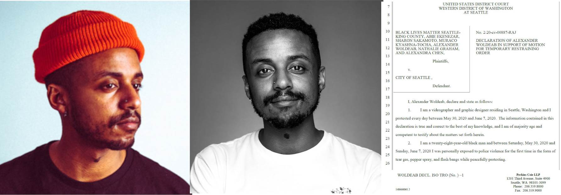 Aka Eskender Woldeab, he admitted in a legal pleading to protesting / rioting every day in Seattle from May 30th through June 7th. He bitched about the pepper spray used by cops. He was later a plaintiff in a lawsuit filed by the ACLU on behalf of BLM protesters. He describes himself as a designer, photographer and videographer. Woldeab lived in Seattle at the time of the riots but may have moved to Brooklyn, we aren't certain. https://archive.ph/bBAiX#selection-1795.10-1795.27 https://web.archive.org/web/20230725161555/https://storage.courtlistener.com/recap/gov.uscourts.wawd.286633/gov.uscourts.wawd.286633.1.0.pdf (p 18)