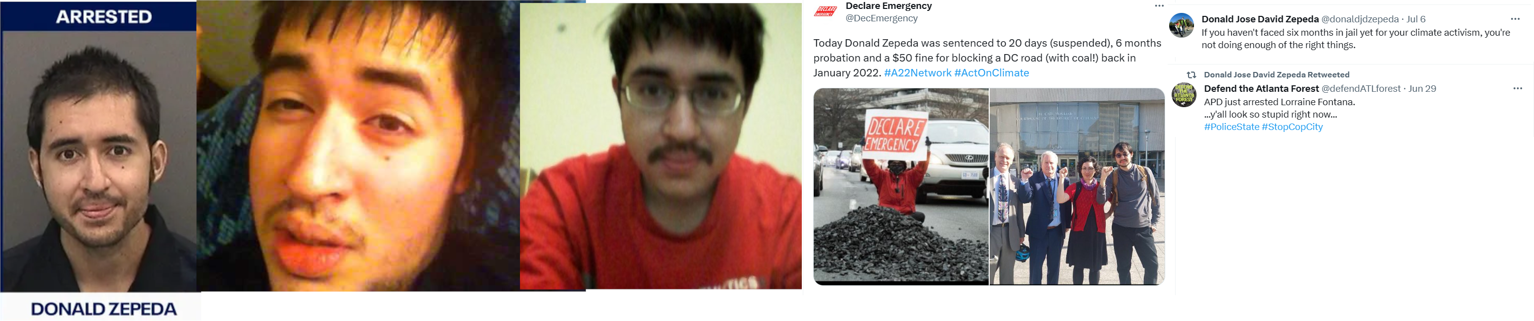 Donald Jose David Zepeda is an organizer for the radical environmental group Declare Emergency and a serial offender. He formerly worked for the equally radical environmental group Extinction Rebellion and may have been affiliated with the Sunrise Movement. Prior to that, he was a sandwich artist at Subway and a cart associate at Sam's Club. In 2017, he attempted to shut off a Kinder Morgan pipeline in Skagit County, Washington and was charged with burglary, criminal sabotage and malicious mischief. In 2021, he vandalized the Florida state capitol by pouring noxious liquids on the capitol steps. When he showed up to serve his sentence, he was arrested for an outstanding warrant for a probation violation. He was arrested in 2021 at a Tampa Bay high school for disrupting the pick-up of students by distributing climate flyers. Also in 2021, he was arrested at a Fort Myers school for trespassing on school grounds, disturbing the peace and failure to leave a school safe zone. In 2022, he blocked a D.C. roadway with coal. He appears to have failed out of Michigan State University after one year. Zepeda is from Michigan but is believed to currently (2023) reside in Seattle, but he does move around a lot. https://archive.ph/KFy4B, https://archive.ph/2PKNZ, https://archive.ph/rDQRI, https://archive.ph/JPIQJ https://www.linkedin.com/in/donald-zepeda-1b263668