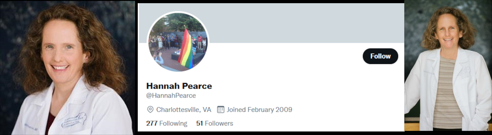Hannah Phillips Pearce (DOB: 07/28/63) participated in the Charlottesville Unite the Right counter protest. She alleged to have been harassed because of her religion (she's Jewish) and injured. She later joined the lawsuit against the UTR organizers. However, a judge determined her supposed injuries were insufficiently connected to the alleged conspiracy. She's a retired dermatologist. Pearce lives in a McMansion in Charlottesville with a man who's probably her SO. Mr. Pearce appears to have moved out. https://web.archive.org/web/20220114043655/https://www.haaretz.com/us-news/jewish-lawyers-to-spearhead-charlottesville-trial-against-white-supremacists-1.10320317 https://web.archive.org/web/20220123220304/https://sojo.net/interactive/lasting-trauma-white-nationalist-violence-charlottesville