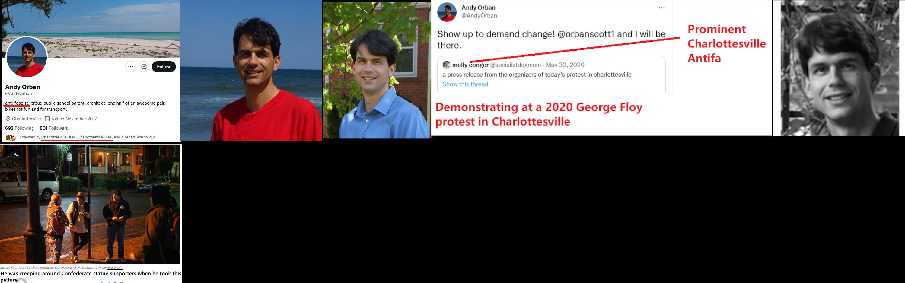 Orban participated in the violent counter-protest to the Unite the Right rally and self-identifies as antifascist on his Twitter feed. He attended a May 2020 George Floyd protest that Charlottesville Antifa member Molly Conger organized and he re-Tweeted her Tweet about the event. He's affiliated with the radical group Showing Up for Racial Justice and admitted attending several of their meetings. He's an architect and owns Orban Design in Charlottesville. Orban's also a member of the Mennonite church, a denomination known for pacifism so it's kind of ironic he attends violent riots. He's a graduate of UVA and Harvard. https://archive.ph/jDC53#selection-1101.14-1101.25 https://archive.ph/OB1a1#selection-5985.6-5985.16 https://www.linkedin.com/in/andyorban